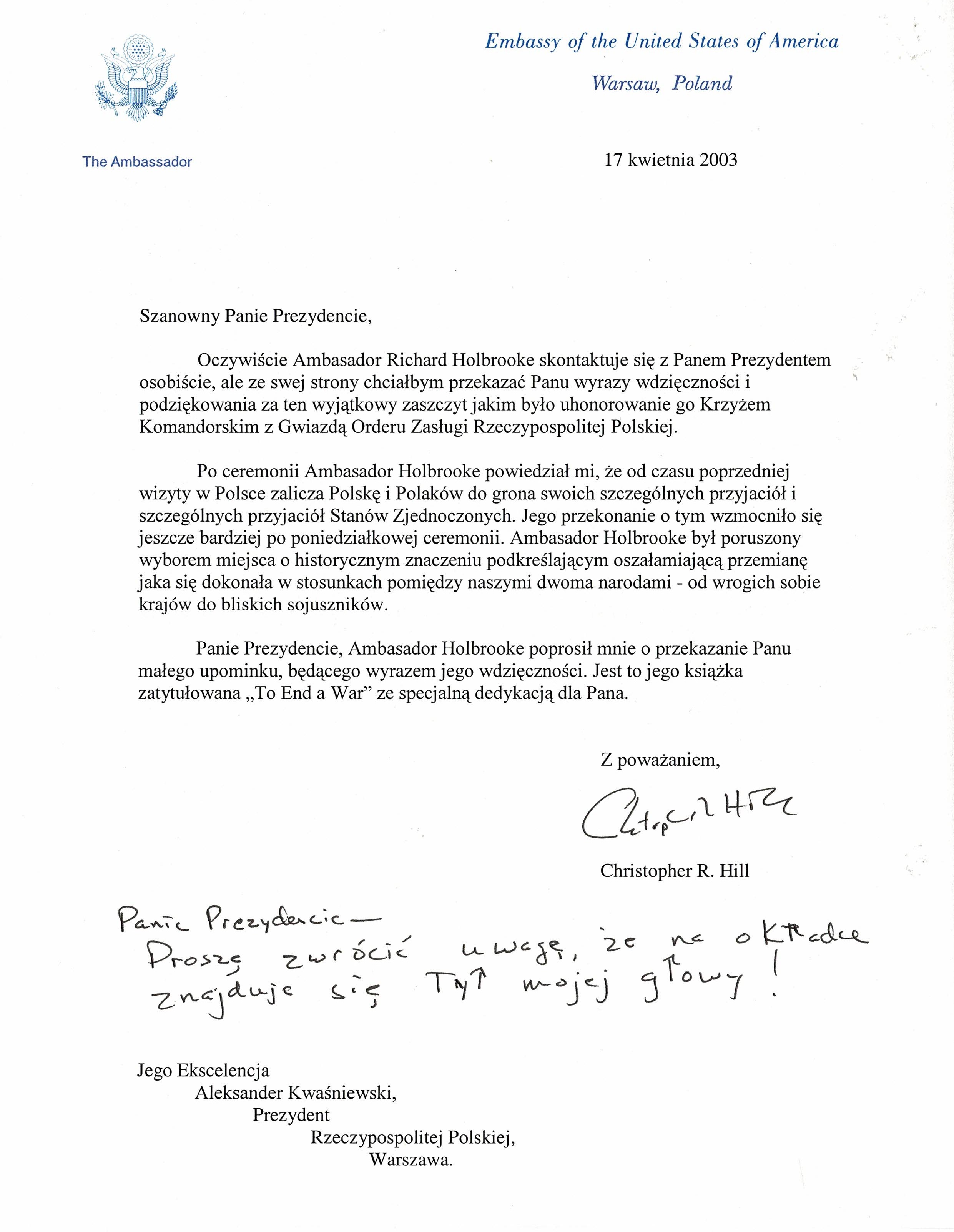 Treść dedykacji: Szanowny Panie Prezydencie, oczywiście Ambasador Richard Holbrooke skontaktuje się z Panem Prezydentem osobiście, ale ze swej strony chciałbym przekazać Paniu wyrazy wdzięczności i podziękowania za ten wyjątkowy zaszczyt jakim było uhonorowanie go Krzyżem Komandroskim z Gwiazdą Orderu Rzeczypospolitej Polskiej. Po ceremonii Ambasador Holboorke powiedział mi, że od czasu poprzedniej wizyty w Polsce zalicza Polskę i Polaków do grona swoich szczególnych przyjaciół i szczególnych przyjaciół Stanów Zjednoczonych. Jego przekonanie o tym wzmocniło się jeszcze bardziej po poniedziałkowej ceremonii. Ambasador Holbrooke był poruszony wyborem miejsca o historycznym znaczeniu podkreślającym oszałamiającą przemianę jaka się dokonała w stosunkach pomiędzy naszymi dwoma narodami - od wrogich sobie krajów do bliskich sojuszników. Panie Prezydencie, Ambasador Holbrooke poprosił mnie o przekazanie Panu małęgo upominku, będącego wyrazem jego wdzięczności. Jes to jego książka zatytułowana "To End a War" ze specjalną dedykacją dla Pana Z poważaniem, Christopher R. Hill , Panie Prezydencie - Proszę zwrócić uwagę, że na okładce znajduje się tył mojej głowy !
