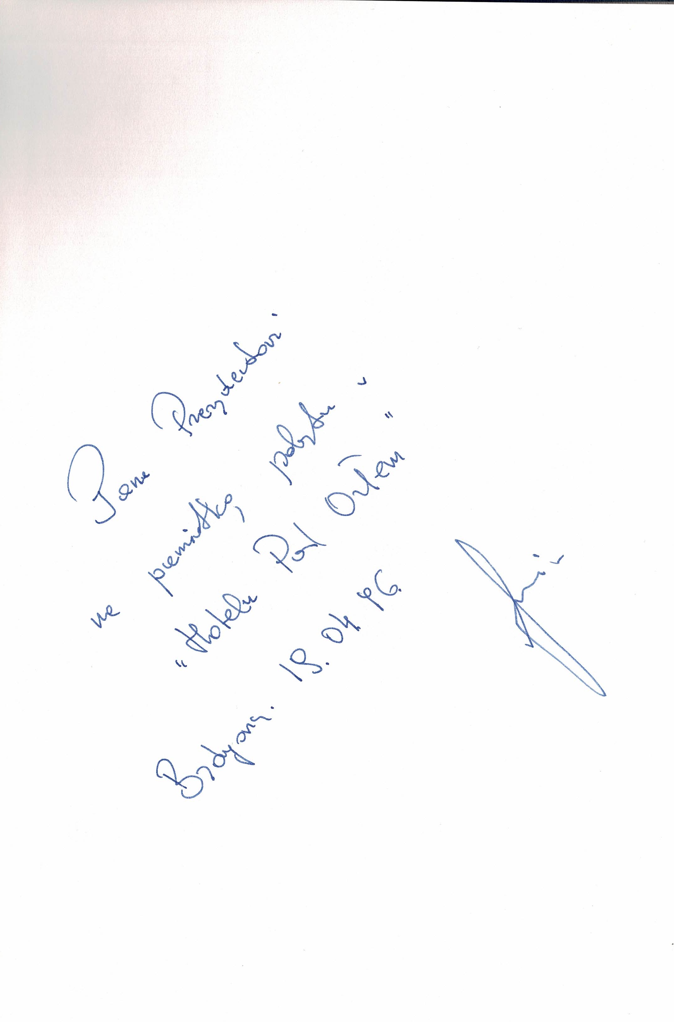 Treść dedykacji: Panu Prezydentowi na pamiątkę pobytu w "hotelu Pod Orłem" Bydgoszcz, 19.04.1996