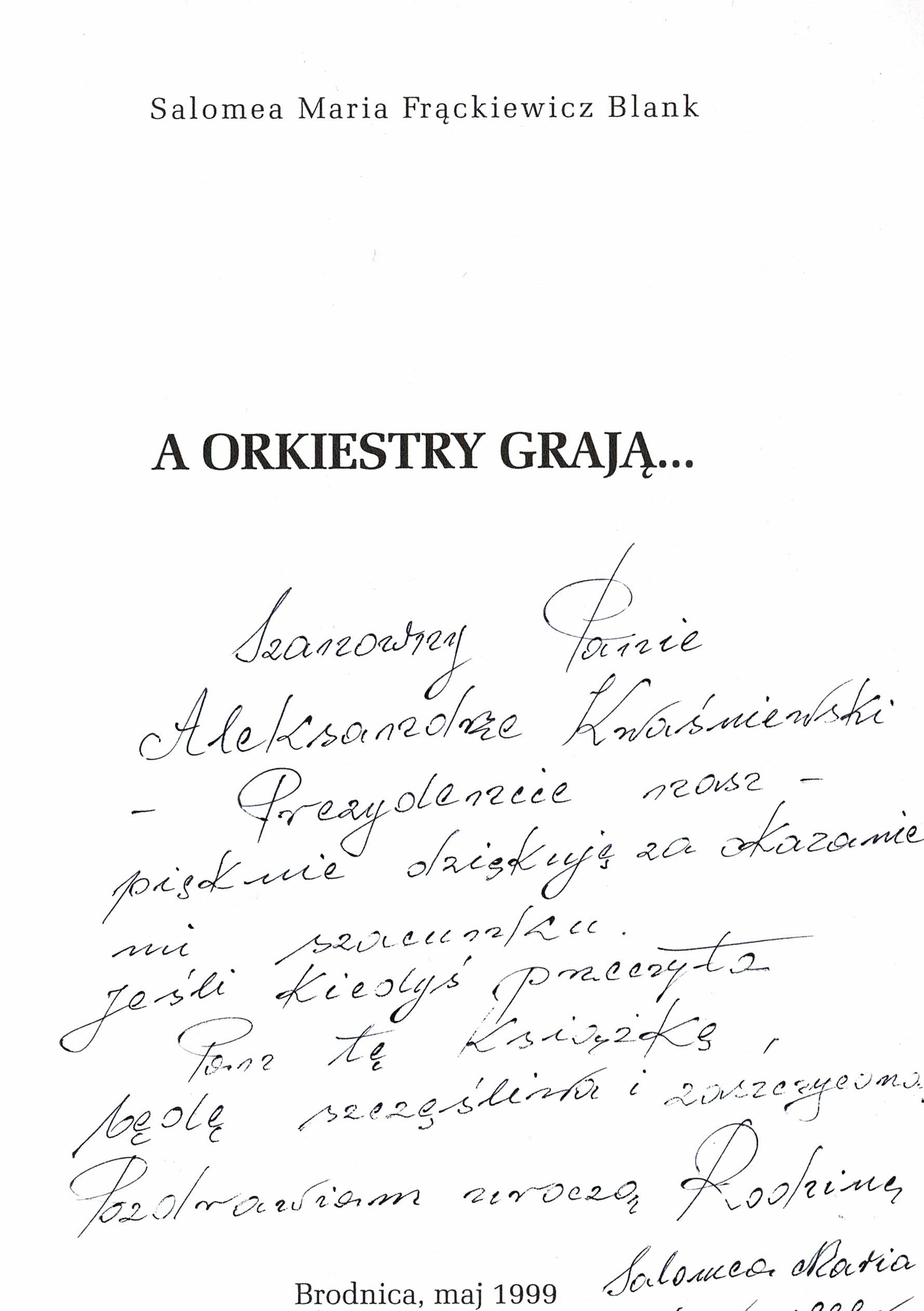 Treść dedykacji: Szanowny Panie Aleksandrze Kwaśniewski - Prezydencie nasz - pięknie dziękuję za okazanie mi szacunku. Jeżeli kiedyś przeczyta Pan te książkę, będę szczęśliwa i zaszczycona. Pozdrawiam uroczą Rodzinę.