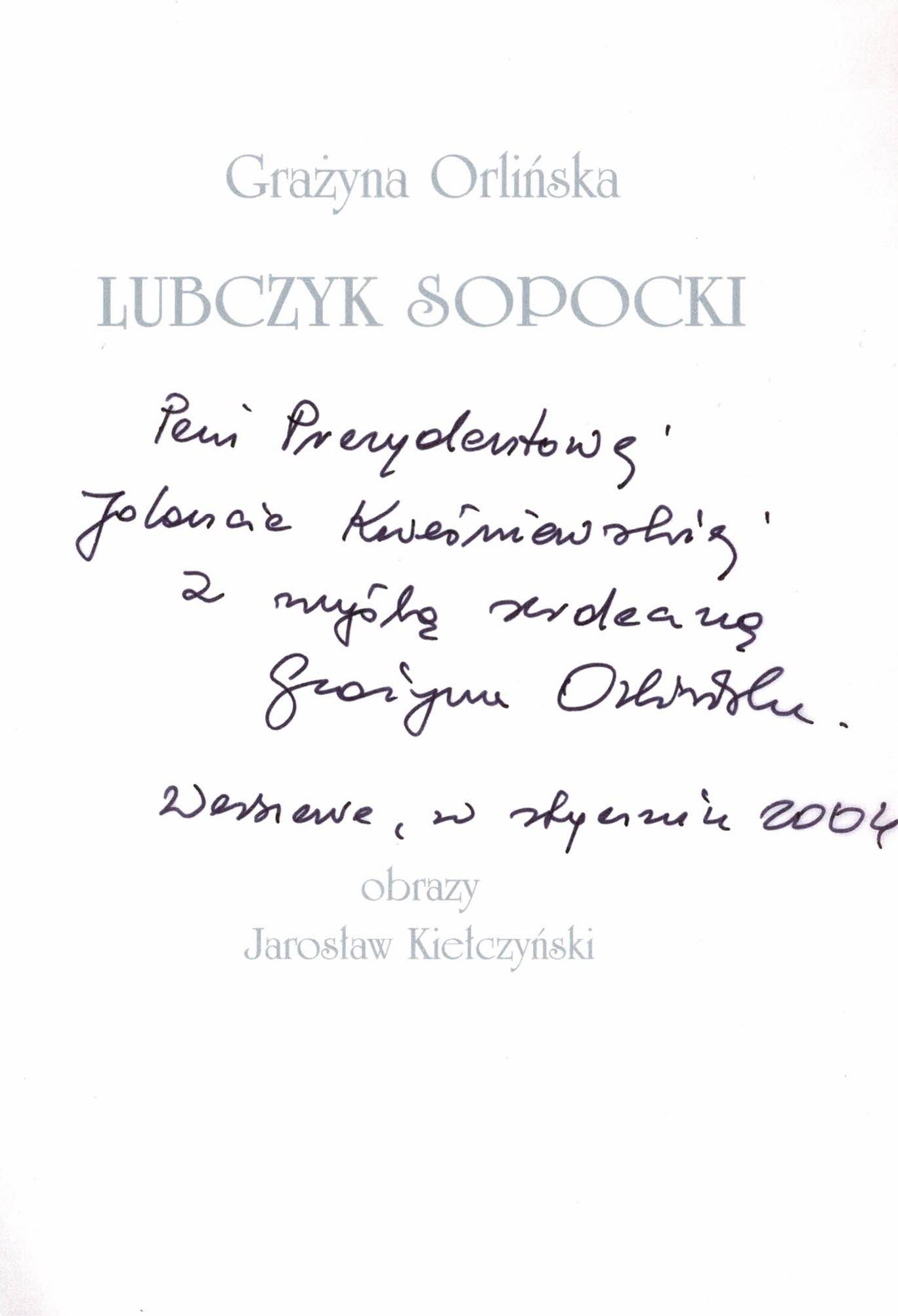 Treść dedykacji: Pani Prezydentowej Jolancie Kwaśniewskiej z myślą serdeczną Grażyna Orlińska
