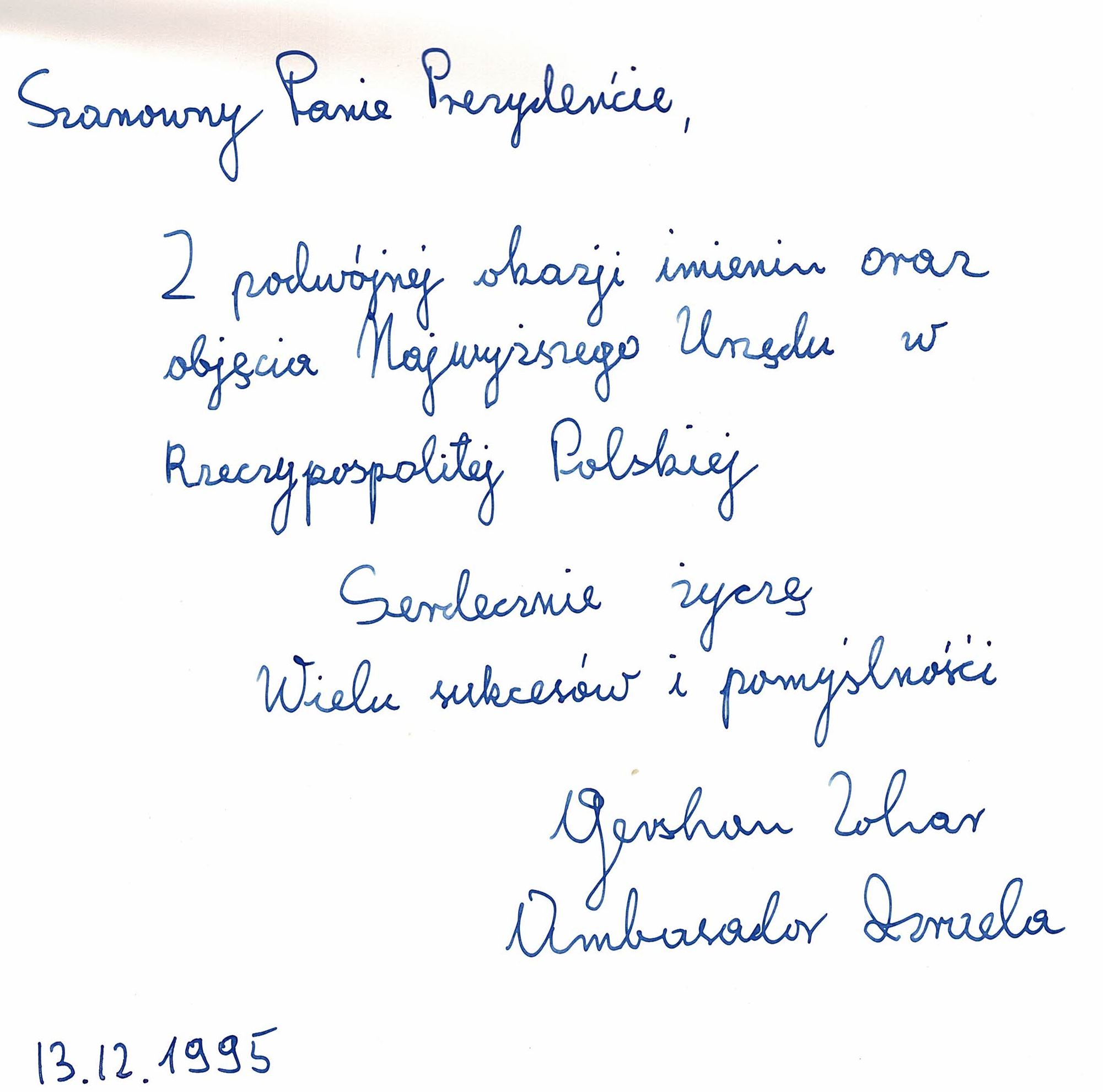 Treść dedykacji: Szanowny Panie Przjacielu, z podwójnej okazji imieniu oraz objęcia Najwyższego Urzędu w Rzeczypospolitej Polskiej Serdecznie życzą Wielu sukcesów i pomyślności