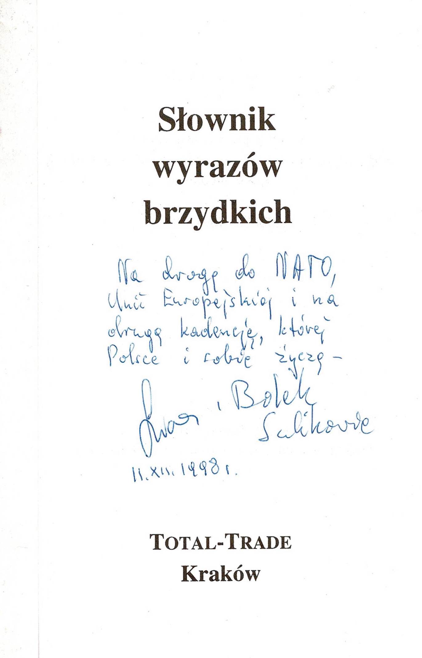 Treść dedykacji: Na drogę do NATO, Uni Europejskiej i na drugą kadencję, której Polsce i Tobie życzą Laura i Bolek