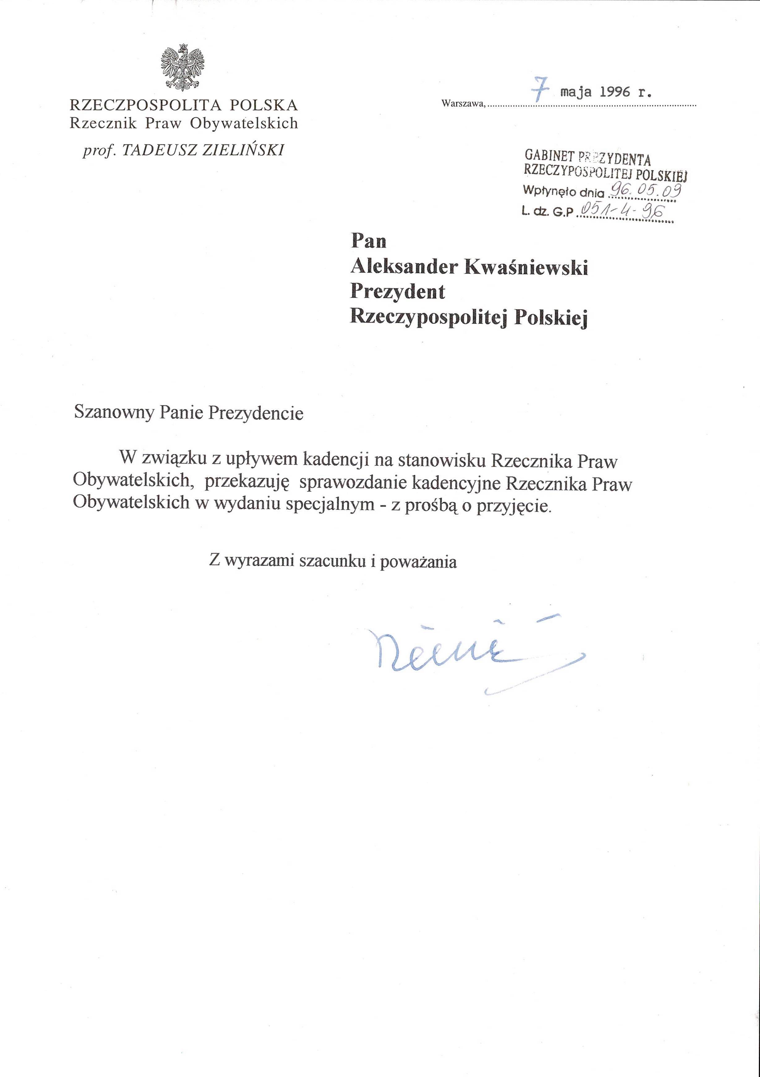 Treść dedykacji: Szanowny Panie Prezydencie W związku z upływem kadencji na stanowisku Rzecznika Praw Obywatelskich, przekazuję sprawozdanie kadencyjne Rzecznika Praw Obywatelskich w wydaniu specjalnym - z prośbą o przyjęcie z wyrazami szacunku i poważania