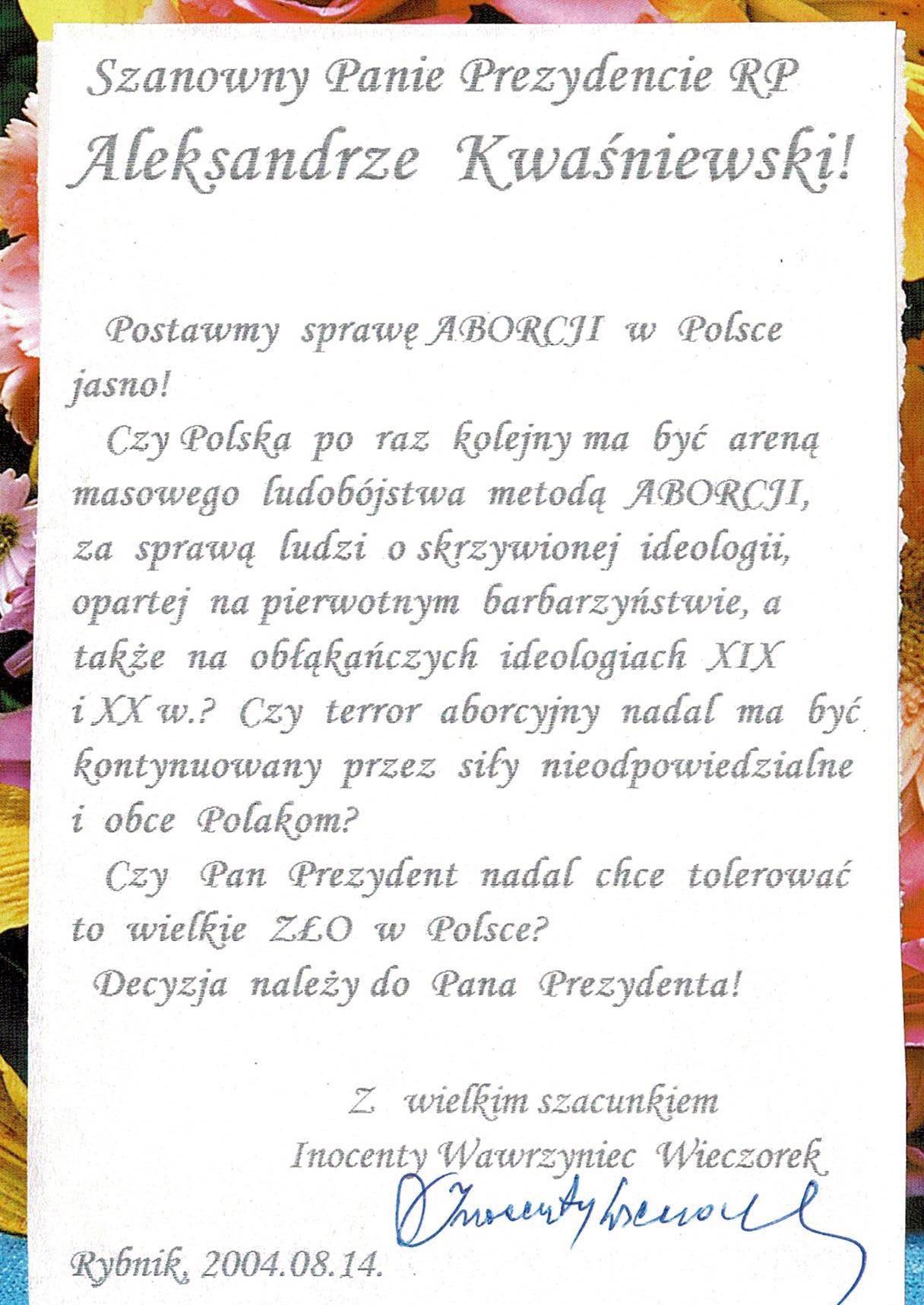 Treść dedykacji : Szanowny Panie Prezydencie RP Aleksandrze Kwaśniewski Postawmy sprawę aborcji w Polsce jasno ! Czy Polska po raz kolejny ma być areną masowego ludobójstwa metodą aborcji, za sprawą ludzi o skrzywionej ideologii, opartej na pierwotnym barbarzyństwie, a także na obłąkańczych ideologiach XIX i XX w.? Czy terror aborcyjny nadal ma być kontynuowany przez siły nieodpowiedzialne i obce Polakom? Czy Pan Prezydent nadal chce tolerować to wielkie ZŁO w Polsce? Decyzja należy do Pana Prezydenta! Z wielkim szacunkiem Inocenty Wawrzyniec Wieczorek , Rybnik, 2004.08.14
