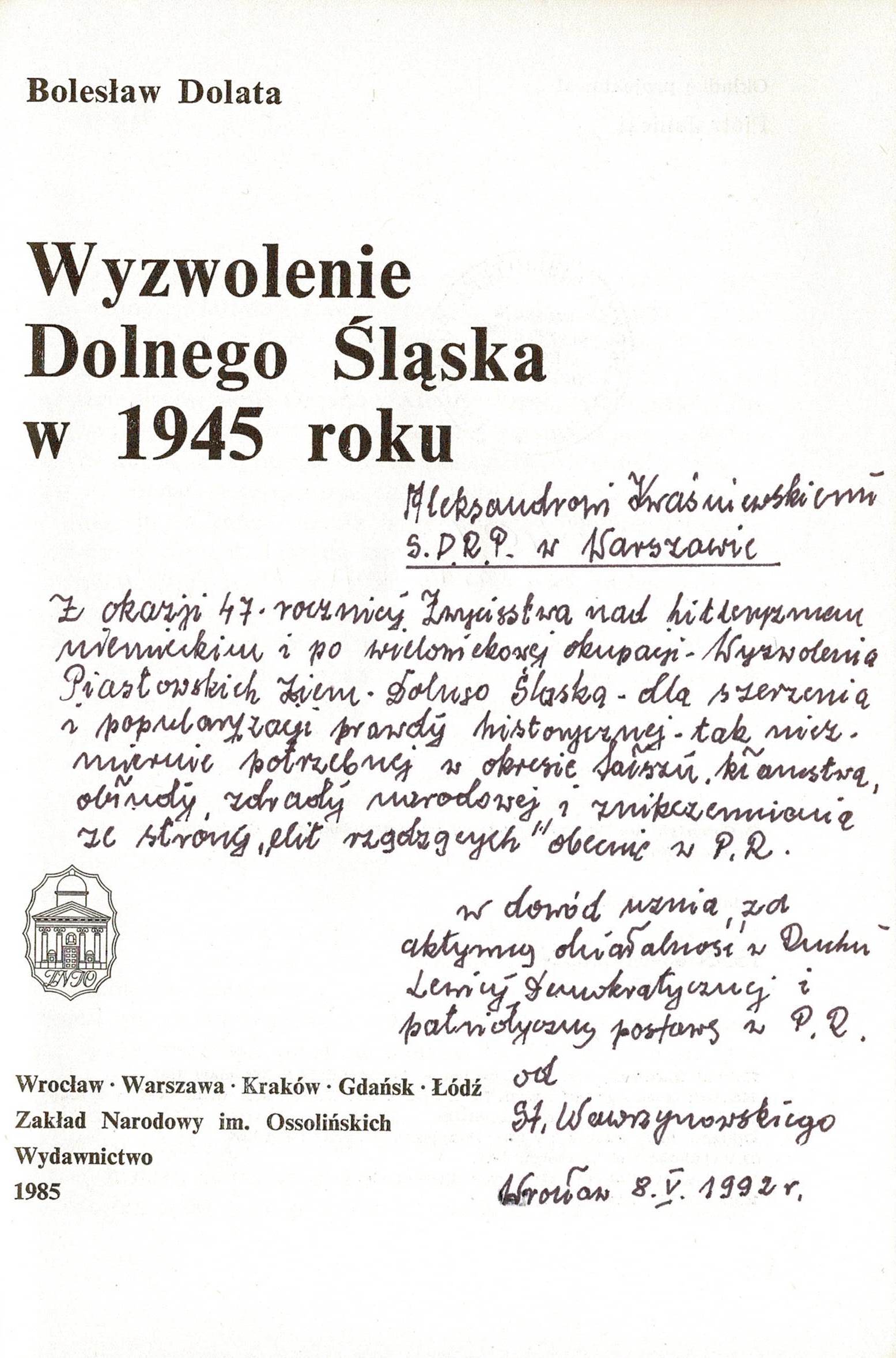 Treść dedykacji: Aleksandrowi Kwaśniewskiemu z okazji 47-rocznicy Zwyciestwa nad hitleryzmem niemieckim i po wielowiekowej okupacji. Wyzwolenie Piastowskich Ziem Dolnego Śląska -dla szerzenia i popularyzacji prawdy historycznej tak tak niezmiernie potrzebnej w obronie szerzeń kłamstwa, obłudy, zdrady narodowej i znikczemnienie ze strony elit rządzących obecnie w P.R.