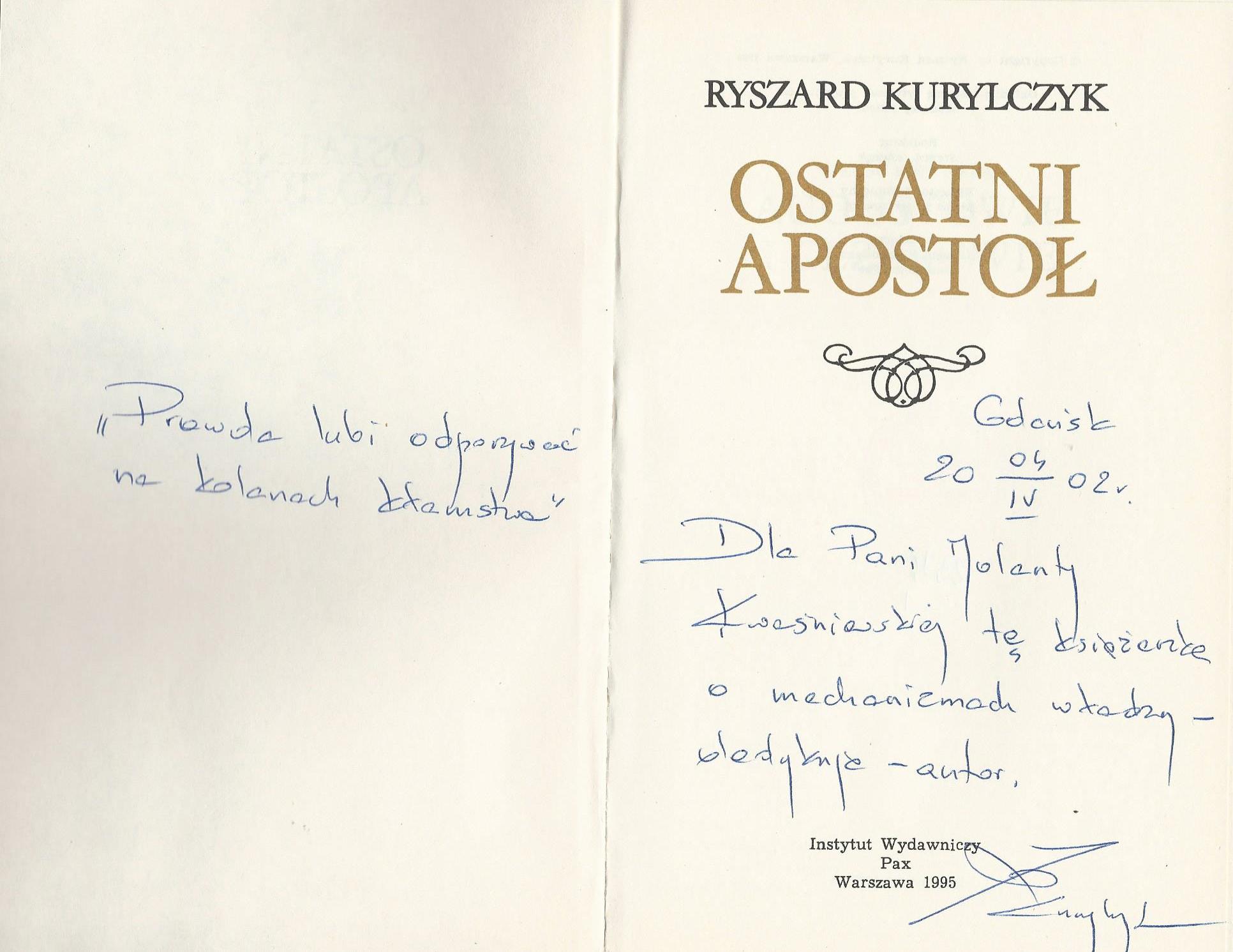 Treść dedykacji: Treść dedykacji: Olku! Dedykacja symboliczna w postaci refleksji: "Wszystko już kiedyś było i wszystko jeszcze kiedyś... będzie" Ryszard. Dla Aleksandra Kwaśniewskiego ostatniego apostoła lewicy /pisze z małej litery, bo wiem, że na apostolstwie Ci nie zależy/ - w dowód szacunku i sympatii. Polecam tekst, bo o... władzy. Autor. Słupsk 18 maja 1995 r.
