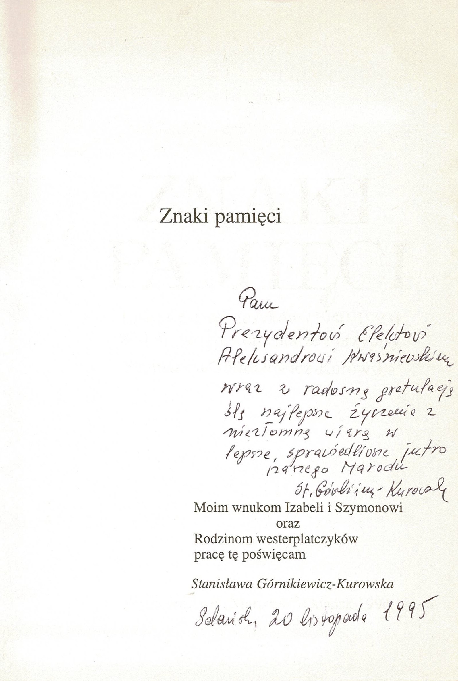 Treść dedykacji: Panu Prezydentowi Elektowi Aleksandrowi Kwaśniewskiemu wraz z radosna gratulacją ślę najlepsze życzenia z niezłomną wiarą w lepsze, sprawiedliwsze jutro naszego Narodu St. Górnikiewicz-Kurowska Gdańsk, 20 listopada 1995.