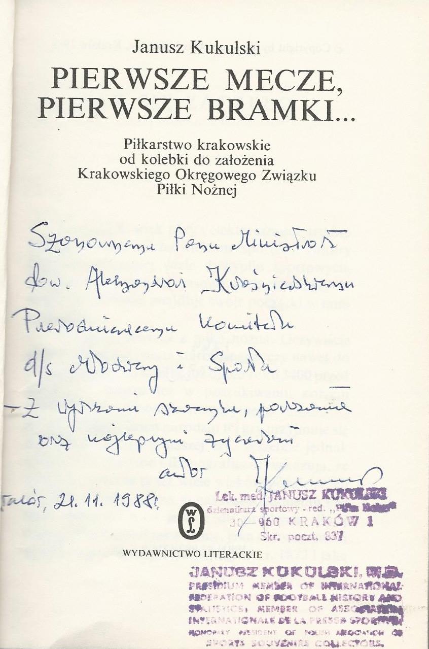 Treść dedykacji: Szanownemu Panu Ministrowi Aleksandrowi Kwaśniewskiemu Przewodniczącemu Komitetowi d/s Młodzierzy i Sportu - z wyrazami szacunku, podziwu, oraz najlepszymi dzyczeniami autor Kukulski Rzeszów,21.11.1988r.