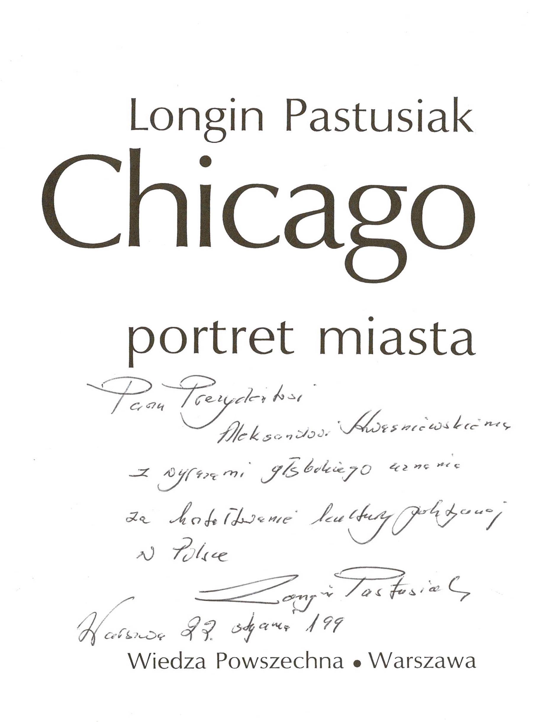 Treść dedykacji: Panu Prezydentowi Aleksandrowi Kwaśniewskiemu z wyrazami głębokiego uznania za kształtowanie kultury politycznej w Polsce
