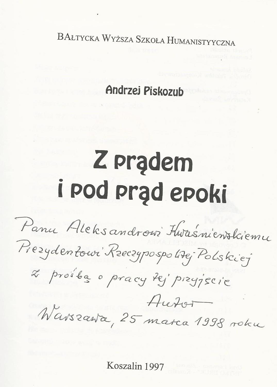 Treść dedykacji: panu Aleksandrowi Kwaśniewskiemu Prezydentowi Rzeczypospolitej POlskiej z prosba o pracy tej przyjęcie Autor Warszawa, 25 mraca 1998 roku