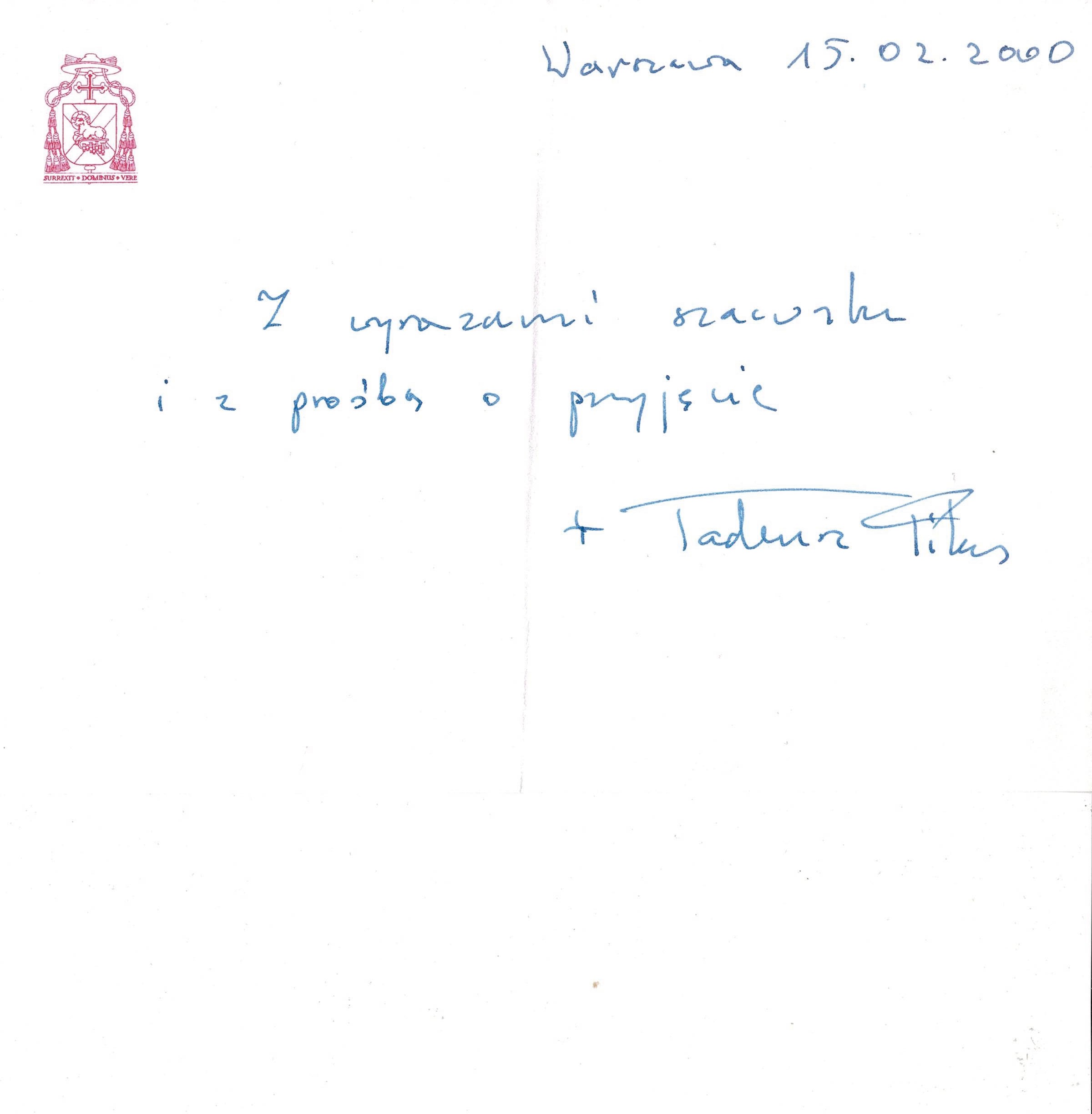 Treść deydkacji: Warszawa 15.02.2000 Z wyrazami szacunku i z prośbą o przyjęcie Tadeusz Pikus.