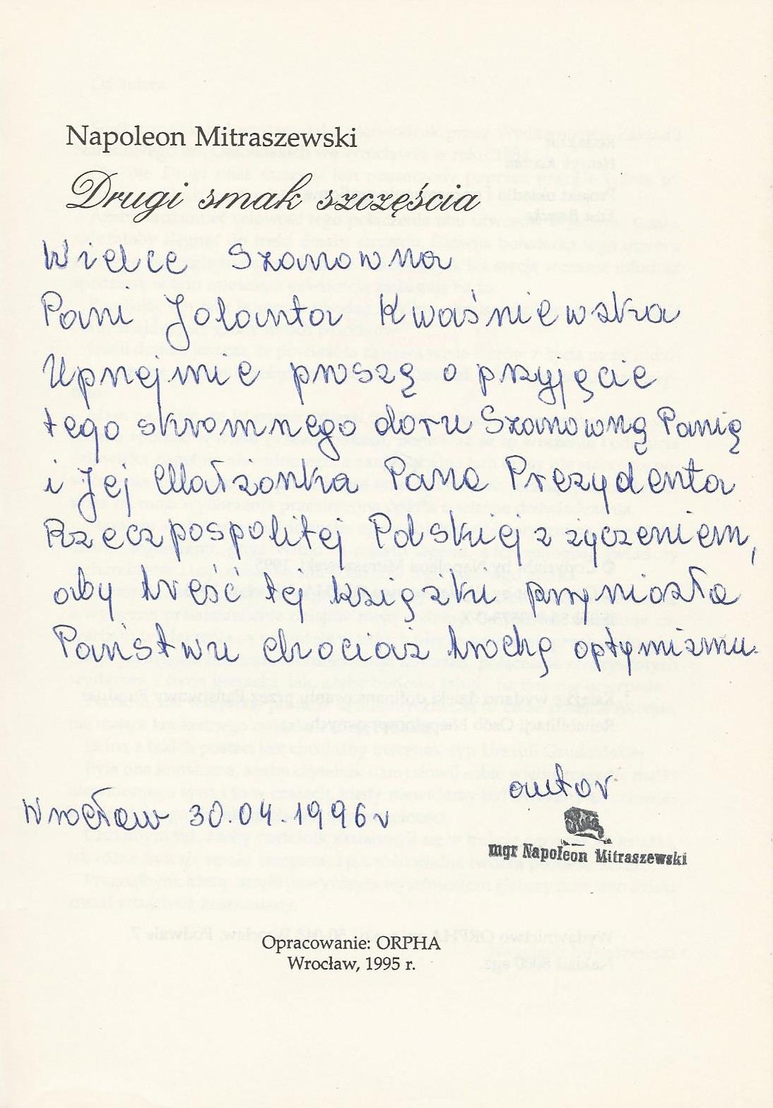 Treść dedykacji: Wielce szanowna Pani Jolanta Kwaśniewska uprzejmie prosze o przyjęcie tegp skromnego daru Szanowną Panią i Jej Małżonka Pana Prezydenta Rzeczpospolitej Polskiej z życzeniem, aby treść tej książki przyniosła Państwu chociaż trochę optymizmu autor Wrocław 30.04.2996 r