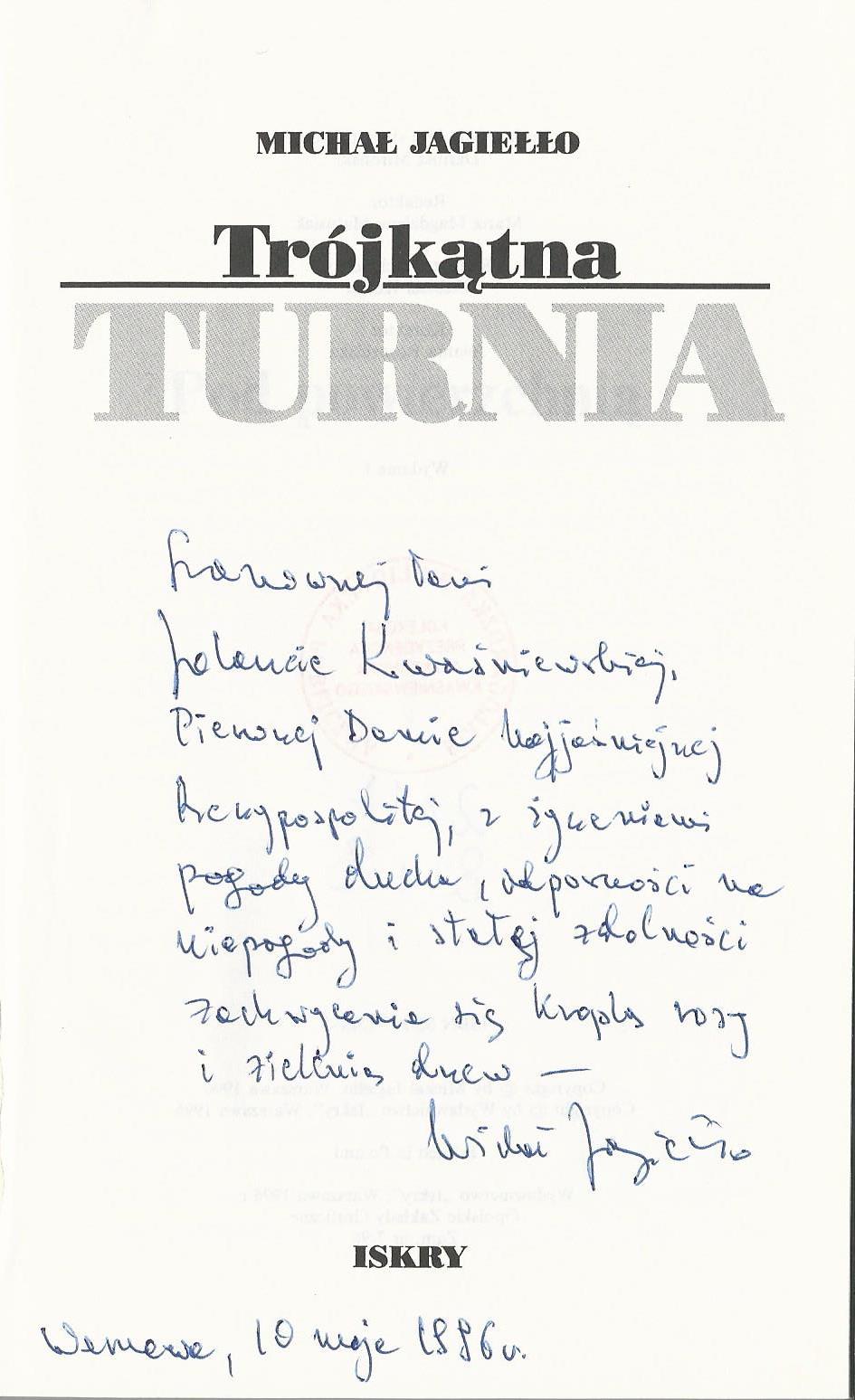 Treść dedykacji: Szanownej Pani Jolancie Kwaśniewskiej Pierwszej Damie Najjaśniejszej Rzeczypospolitej z życzeniami pogody ducha, odporności na niepogody i stałej zdolności zachwycania się kroplą rosy i zielonością drzew- Michał Jegiełło Warszawa, 10 maja 1996 r.