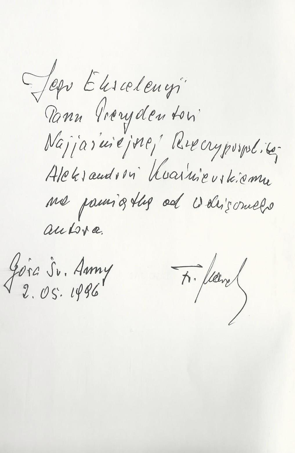 Treść dedykacji: Jego Ekscelencji Panu Prezydentowi Najjaśniejszej Rzeczypospolitej Aleksandrowi Kwaśniewskiemu na pamiątke od wdzięcznego autora Góra Św. Anny 2.051996 Fr.Marek