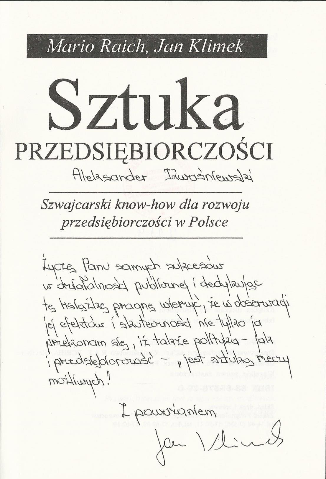 Treść dedykacji: Życzę Panu samych sukcesów w działalności publicznej i dedykując tę książkę pragnę wierzyć, że w obserwacji jej efektów i skuteczności nie tylko ja przekonam się, iż także polityka- jak i przedsiębiorczość- "jest sztuką rzeczy mozliwych" Z poważaniem Jan Klimek