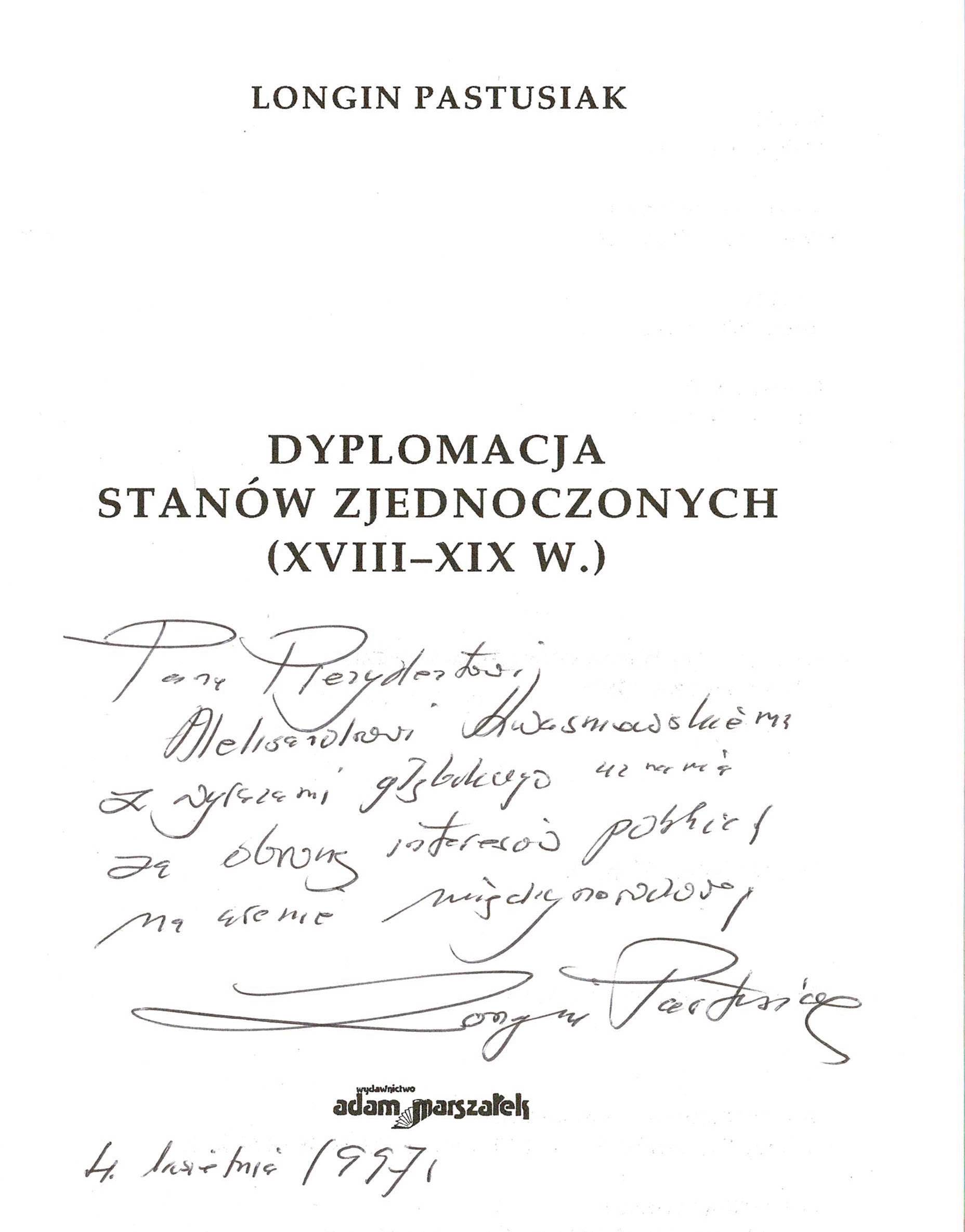 Treść dedykacji: Pan Prezydentowi Aleksandrowi Kwaśniewskiemu z wyrazami głębokiego uznania za obronę interesów polskich na arenie międzynarodowej Longin Pastusiak