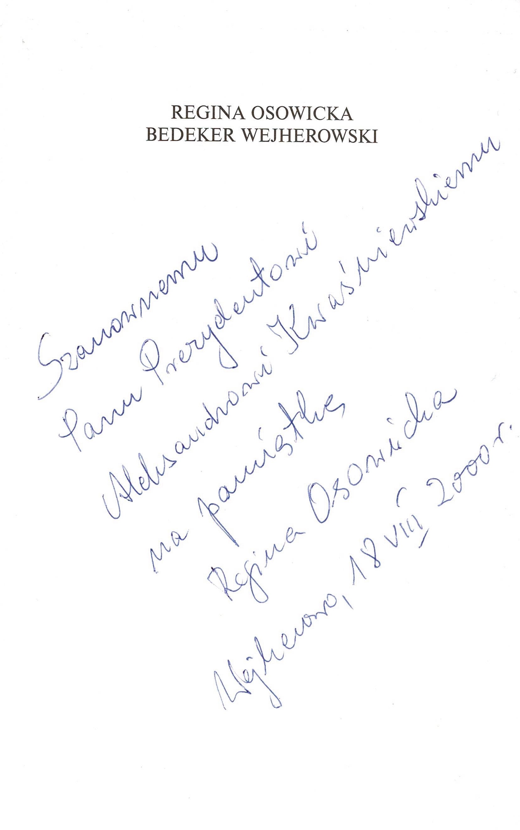 Treść dedykacji: Szanownemu Panu Prezydentowi Alkesandrowi Kwaśniewskiemu na pamiątkę Rgina Osowicka Weherowo, 18 VIII 2000 r.