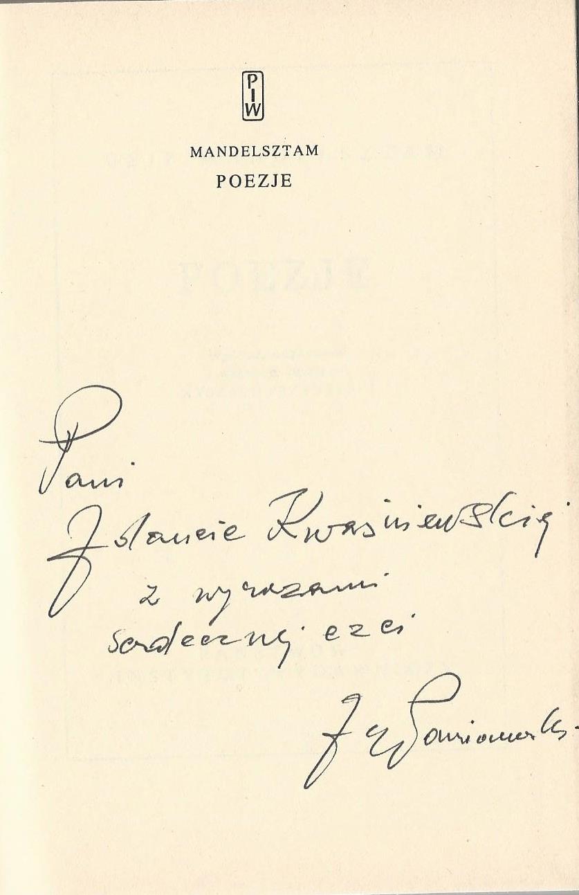 Treść dedykacji: Pani Jolancie Kwaśniewskiej z wyrazami serdeznej czci