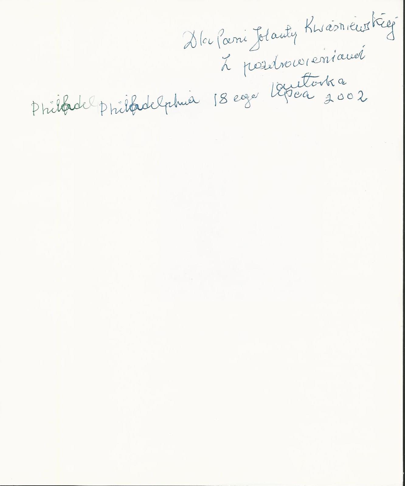 Treść dedykacji:Dla Pani Jilanty Kwaśniewskiej z pozdrowieniami laureatka Philadelphia 18 tego lipca 2002