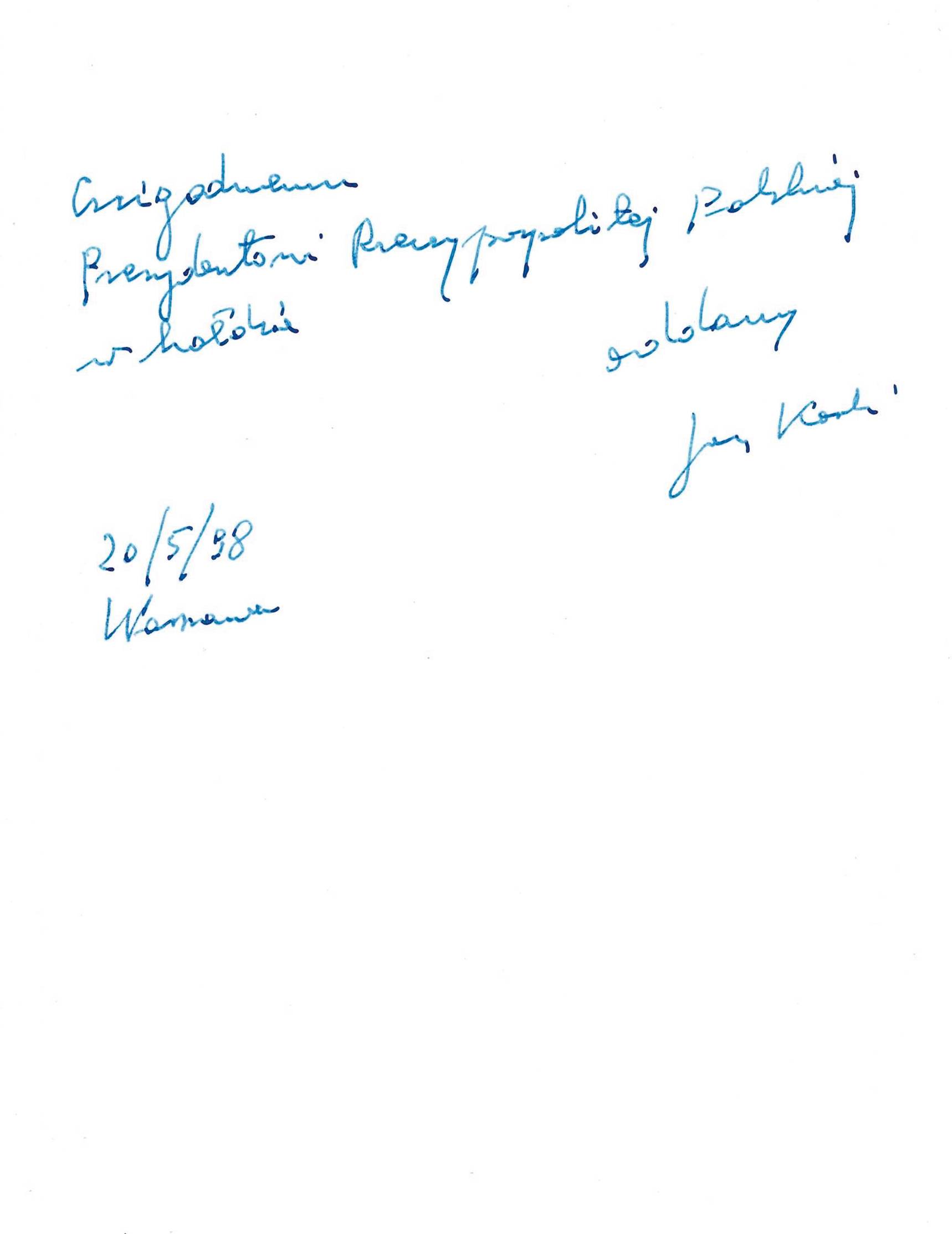 Treśc dedykacji: Czcigodnemu Prezydentowi Rzeczypospolitej Polskiej oddany Jan Karski, 20/5/98 Warszawa
