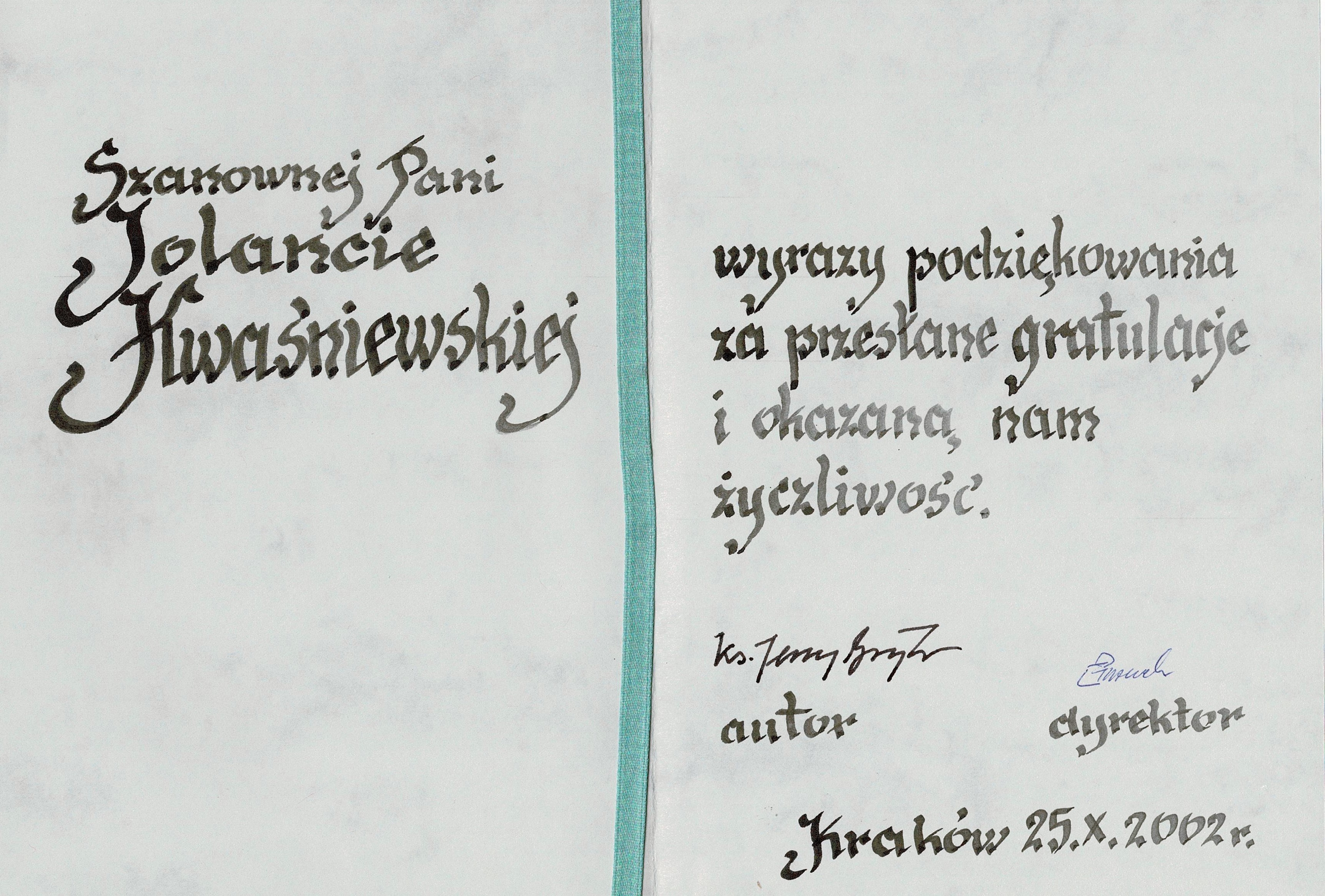 Treść dedykacji: Szanownej Pani Jolancie Kwaśniewskiej wyrazy podziękowania za przesłane gratulacje i okazaną nam życzliwość. Autor ks. Jerzy Bryła, dyrektor (nieczytelne) Kraków, 25 X 2002 r.