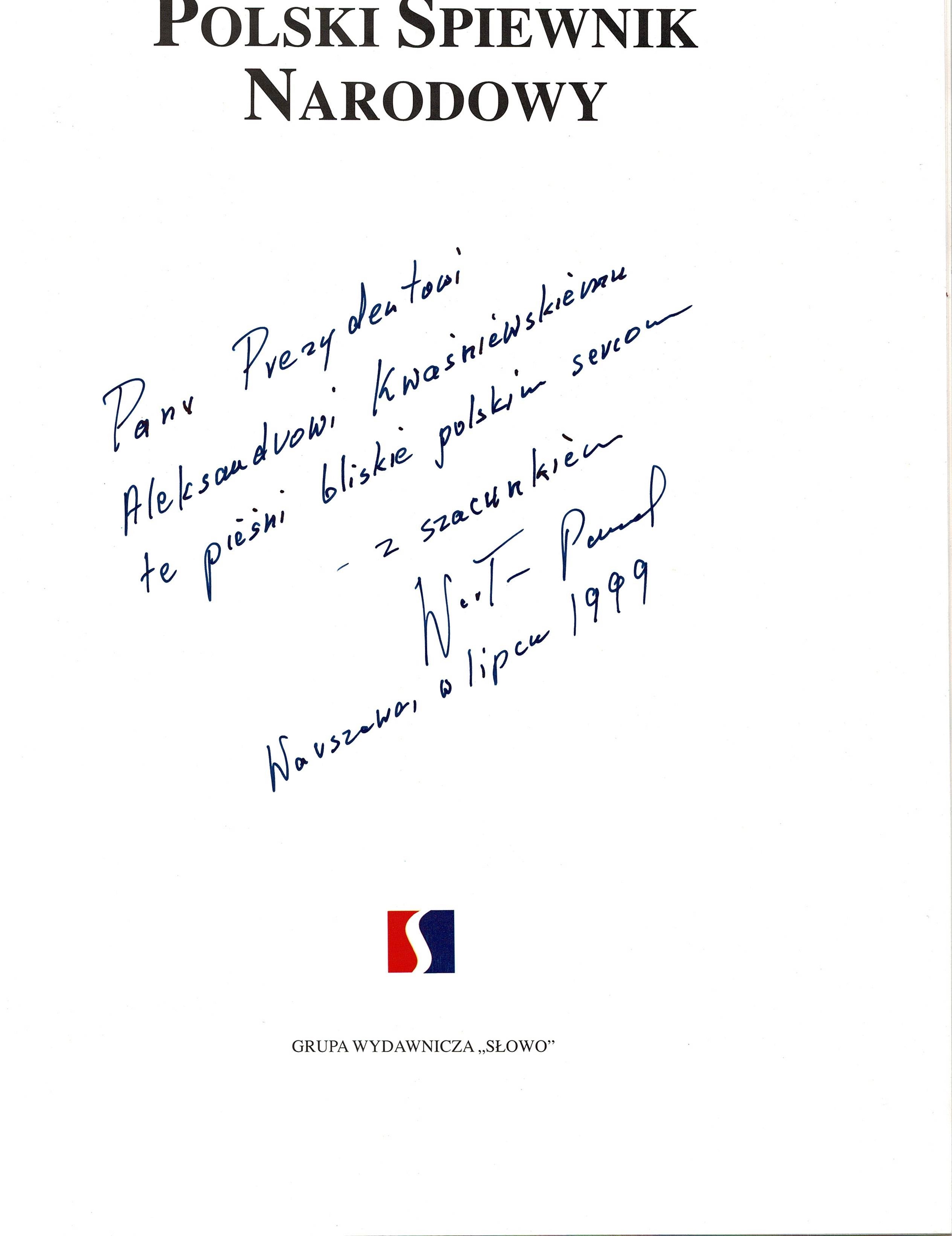 Treść dedykacji: Panu Prezydentowi Aleksandrowi Kwaśniewskiemu te pieśni bliskie polskim sercom - z szacunkiem