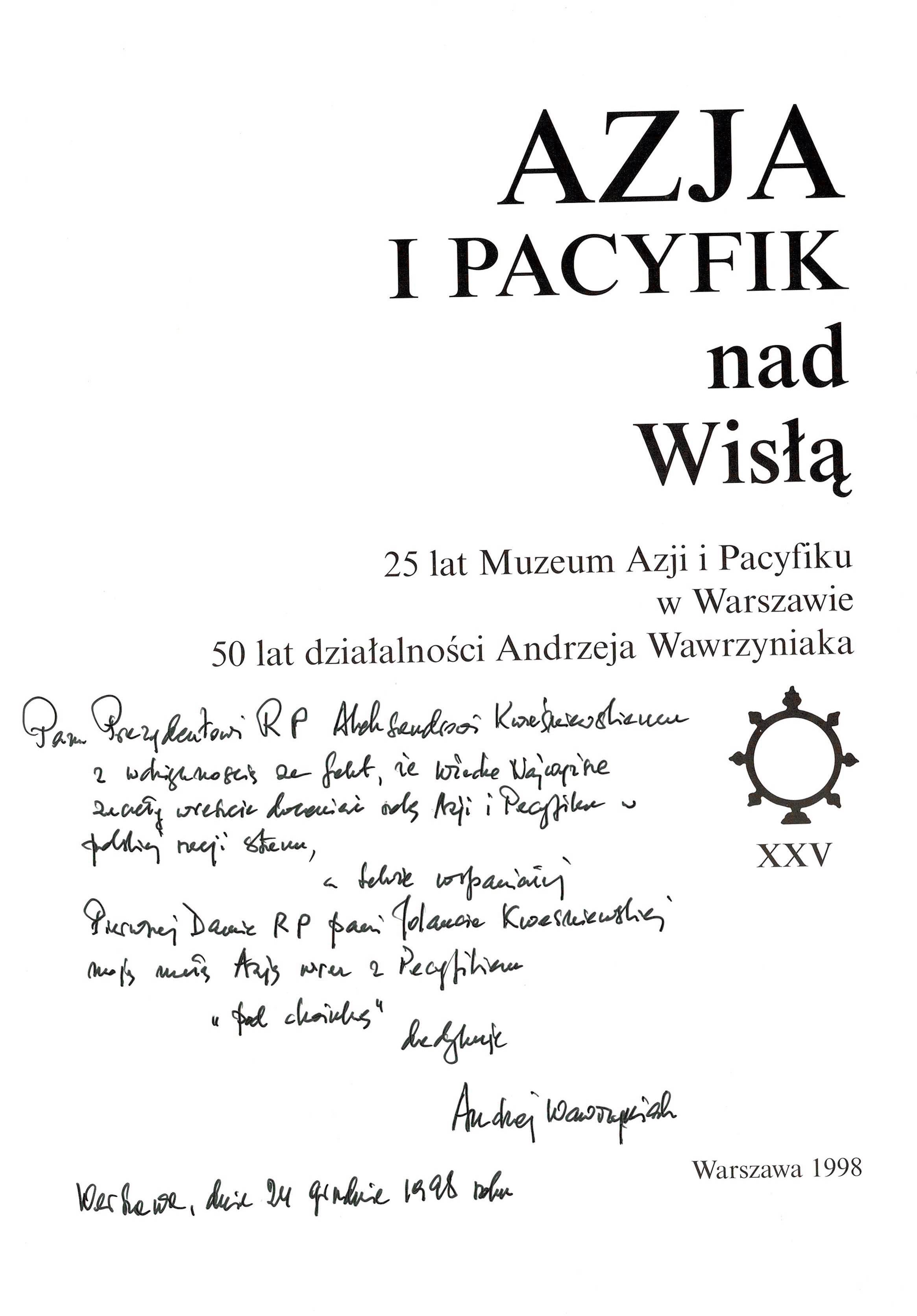 Treść dedykacji: Panu Prezydentowi RP Aleksandrowi Kwaśniewskiemu z wdziecznością za fakt, że...