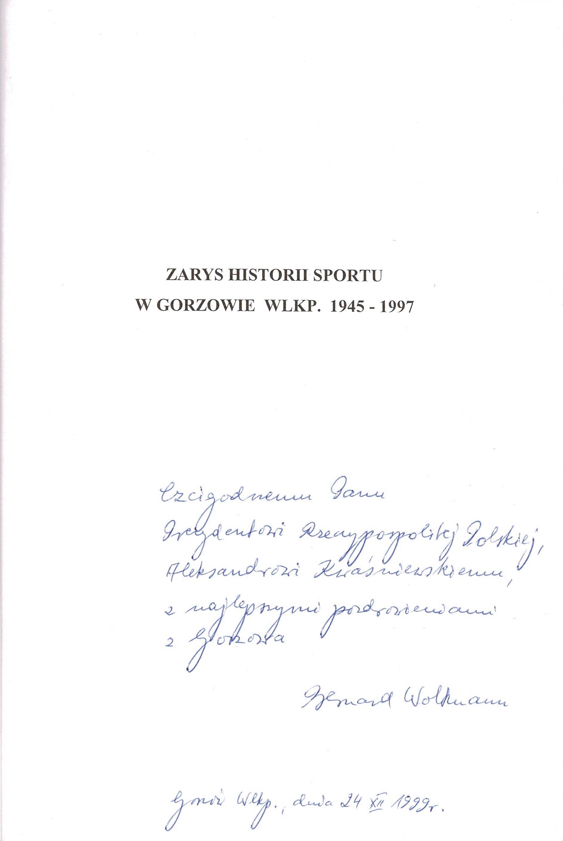 Treść dedykacji: Czcigodnemu Panu Prezydentowi Rzeczypospolitej Polskiej, Aleksandrowi Kwaśniewskiemu, z najlepszymi pozdrowieniami z Gorzowa Bernard Woltmann Gorzów Wlkp., dnia 24 XII 1999 r.