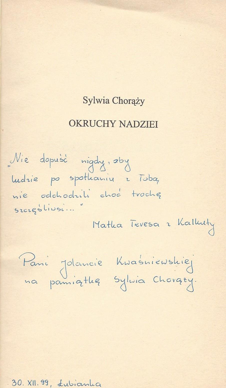 Treść dedykacji: "Mie dopuść nigdy, aby ludzie po spotkaniu z Toba nie odchodzili choć trochę szczęśliwsi..." Matka Teresa z Kalkuty Pani Jolancie Kwasniewskiej na pamiątkę Sylwia Chprąży. 30.XII.99,Łubianka