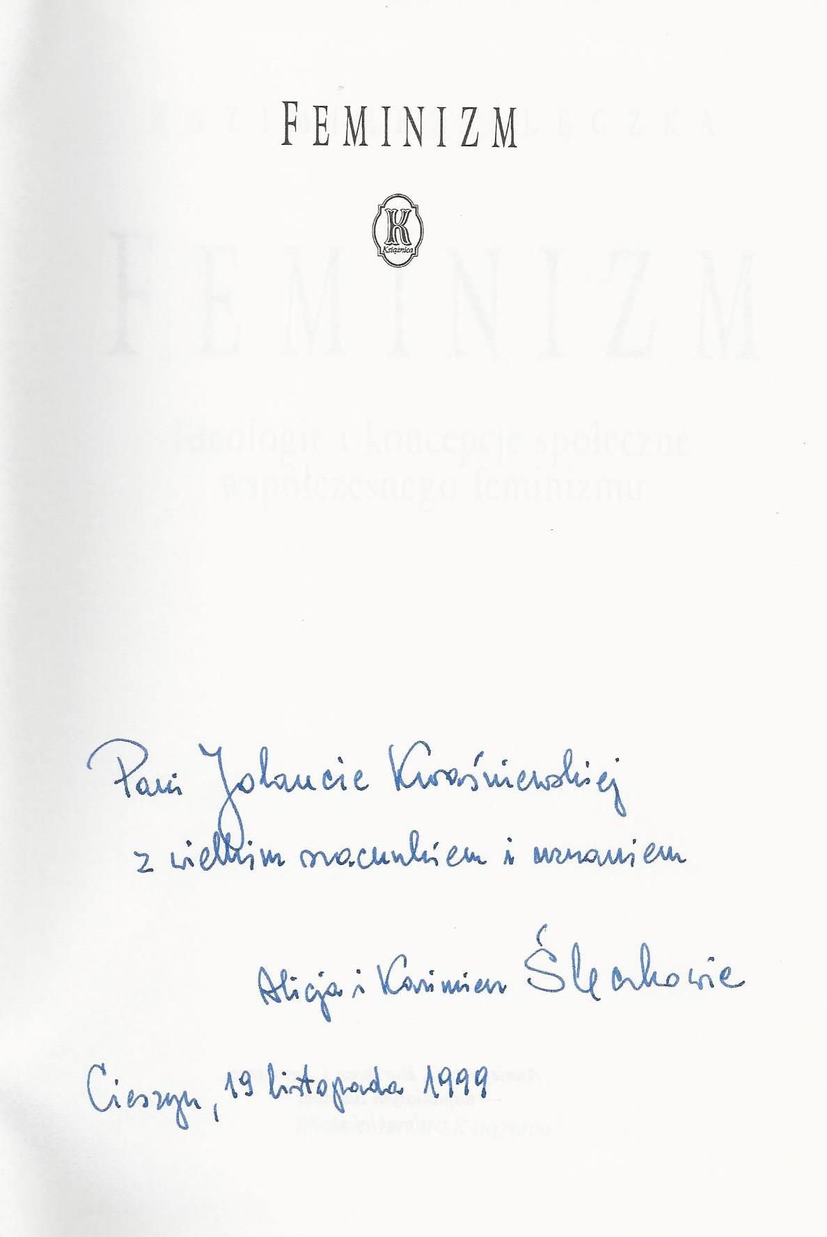 Treśc dedykacji: Pani Jolancie Kwaśniewskiej z wielkim szacunkiem i uznaniem Alicja i Kazimierz Ślęczakowie Cieszyn, 19 listopada 1999