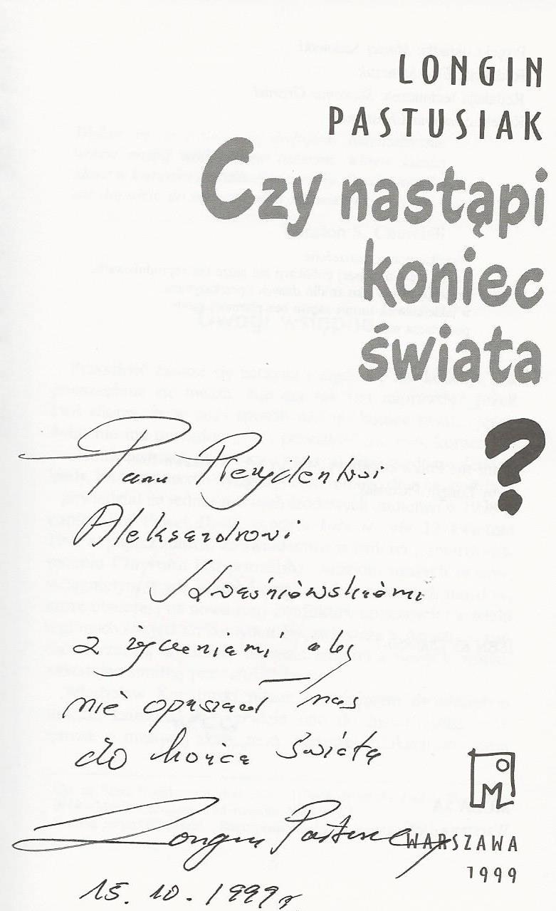 Treść dedykacji: Panu Prezydentowi Aleksandrowi Kwasniewskiemu z życzeniami aby bie opanował nas koniec świata Longin Pastusik 15.10.1999r.
