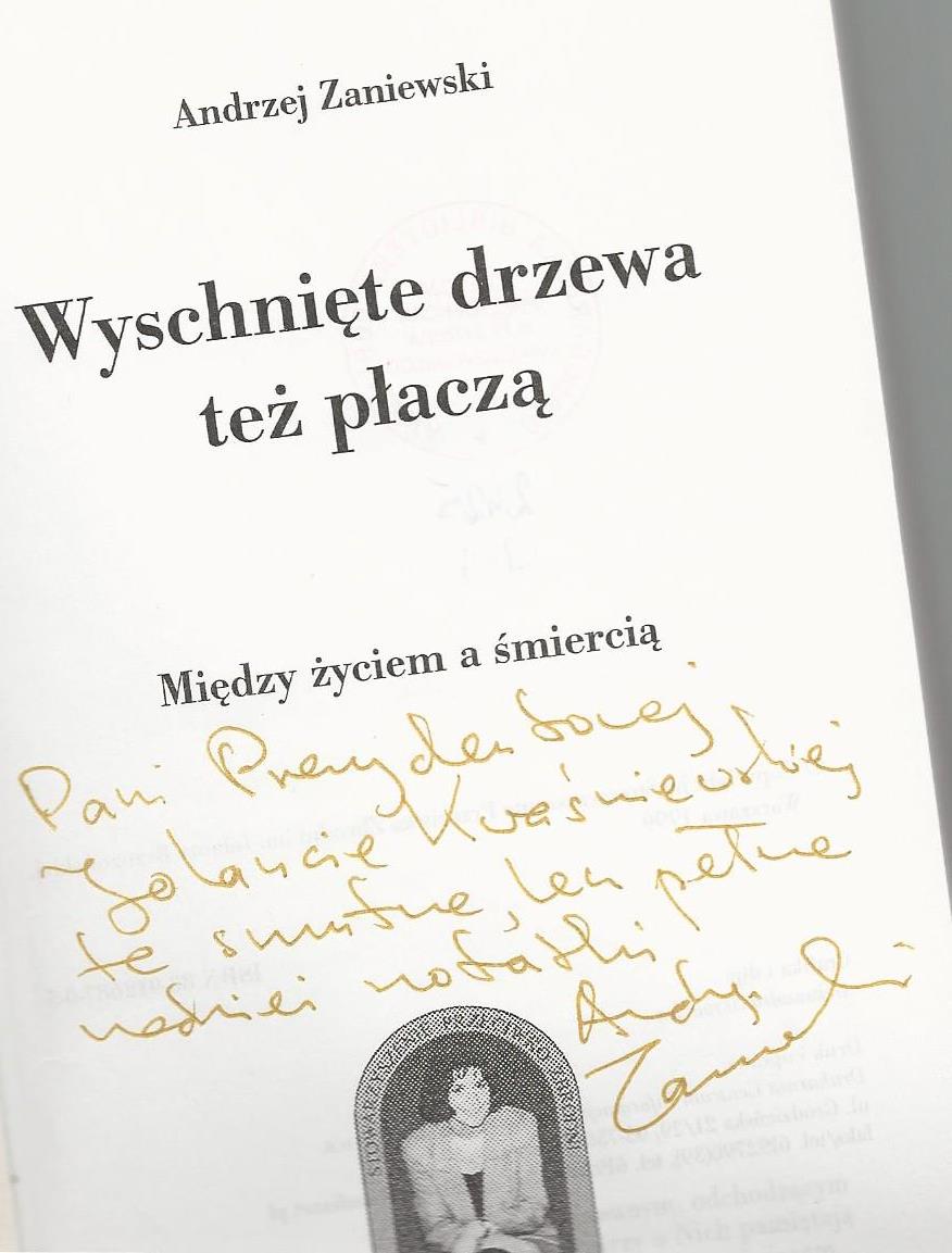 Treść dedykacji: Pani Prezydentowej Jolancie Kwaśniewskiej te smutne, łez pełne nadziei radości Andrzej Zaniewski Warszawa, 28 luty 2000