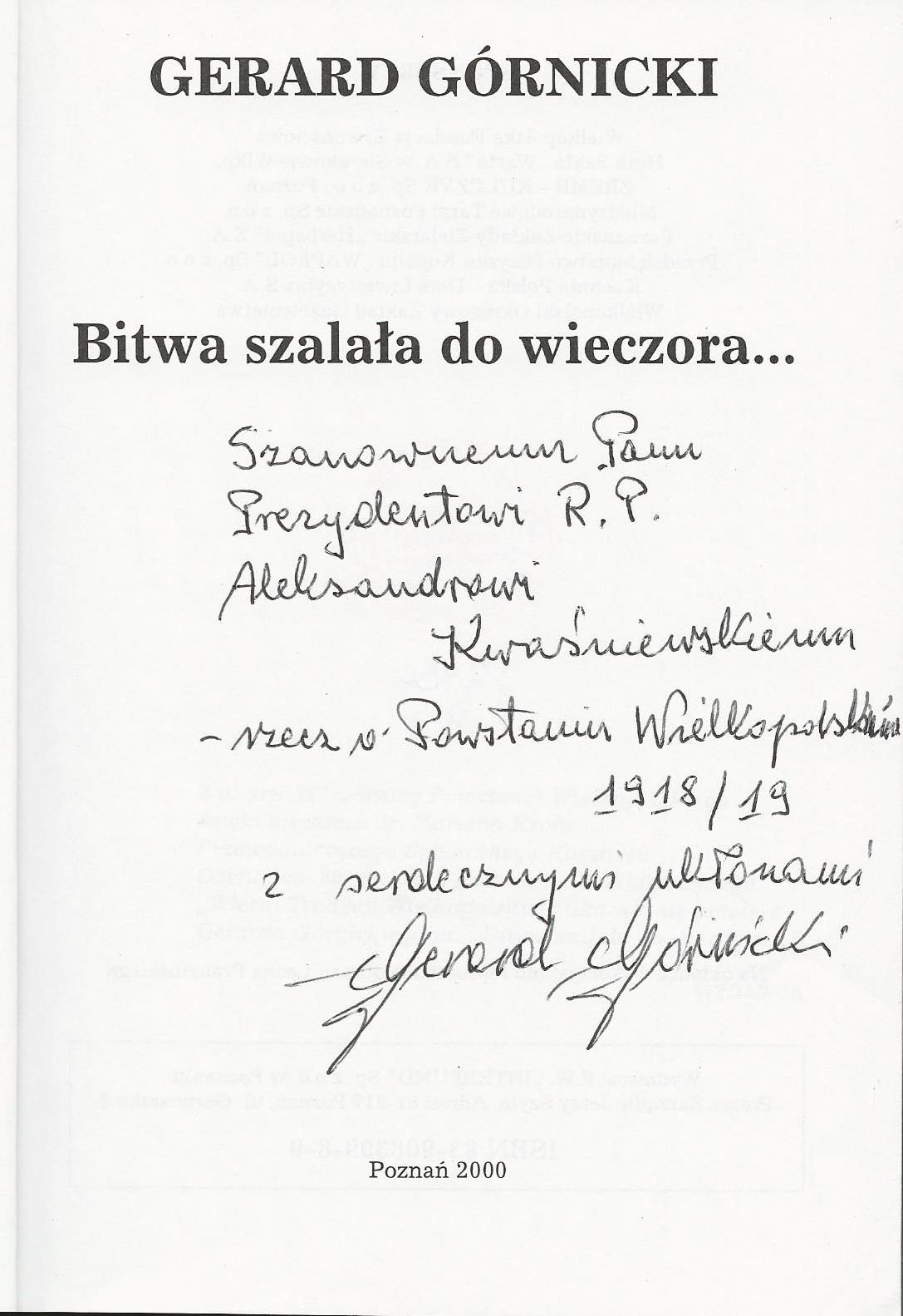 Treść dedykacji: Szanownemu Panu Prezydentowi R. P. Aleksandrowi Kwaśniewskiemu - rzecz o Powstaniu Wielkopolskim 1918-1919 z serdecznymi życzeniami Gerard Górnicki