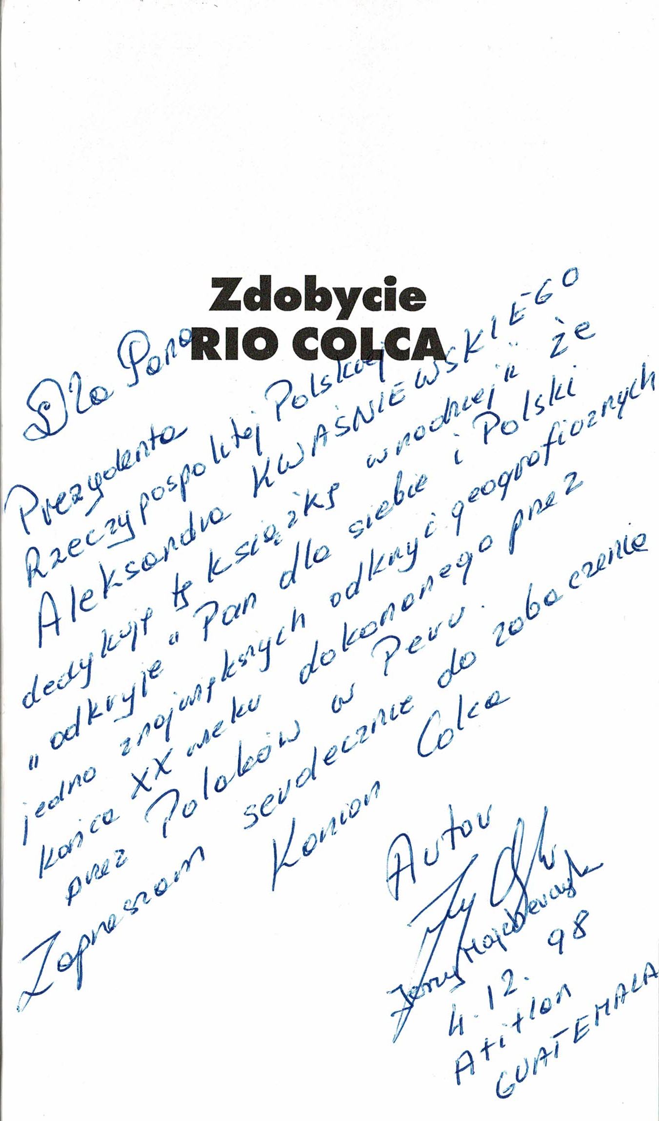 Treść dedykacji: Dla Pana Prezydenta Rzeczypospolitej Polskiej Aleksandra Kwaśniewskiego dedykuję tę książkę w nadziei, że "pdkryje" Pan dla siebie i Polski jedno z największych odkryć geograficznych końca XX wieku dokonanego przez Polaków w Peru. Zapraszam serdecznie do zobaczenia Kanion Colca