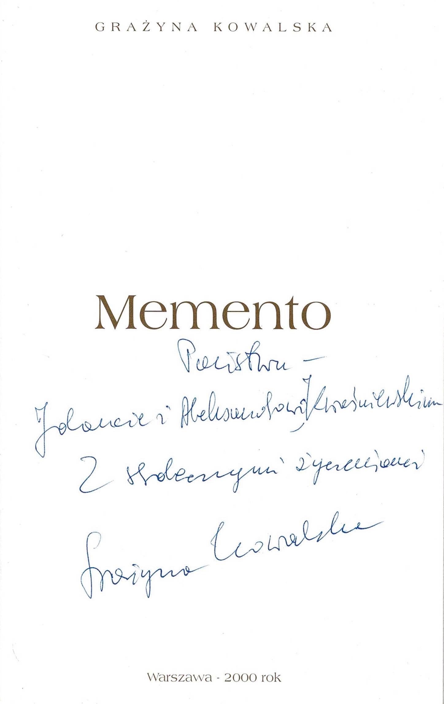 Treść dedykacji: Państwu - Jolancie i Aleksandrowi Kwaśniewskim z serdecznymi życzeniami Grażyna Kowalska