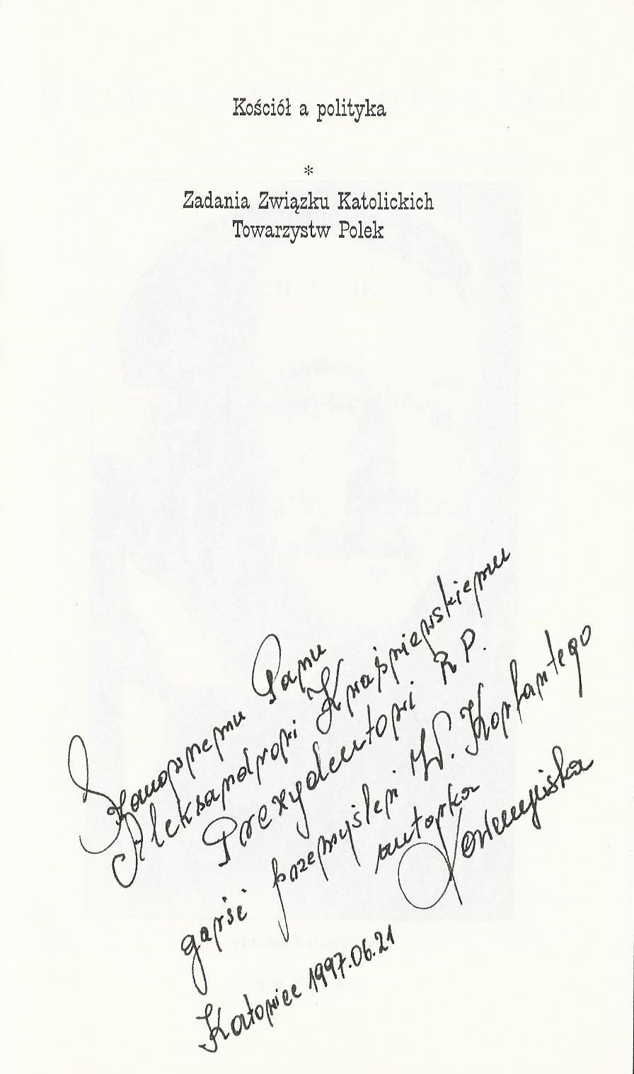 Treść dedykacji: Szanownemu Panu Aleksandrowi Kwaśniewskiemu Prezydentowi RP.garść przemyśleń W. Korfantego autorka Kowczyńska. Katowice 1997.06.21