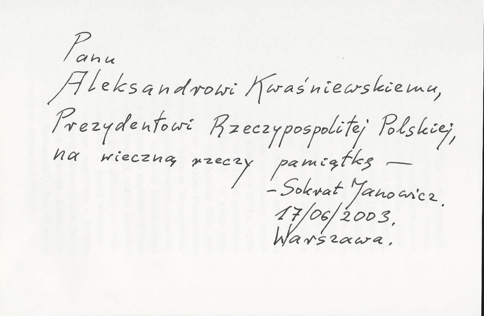 Treść dedykacji: Panu Aleksandrowi Kwaśniewskiemu Prezydentowi Rzeczypospolitej Polskiej, na wieczną rzeczy pamiątkę - Sokrat Janowicz. 17/06/2003. Warszawa.