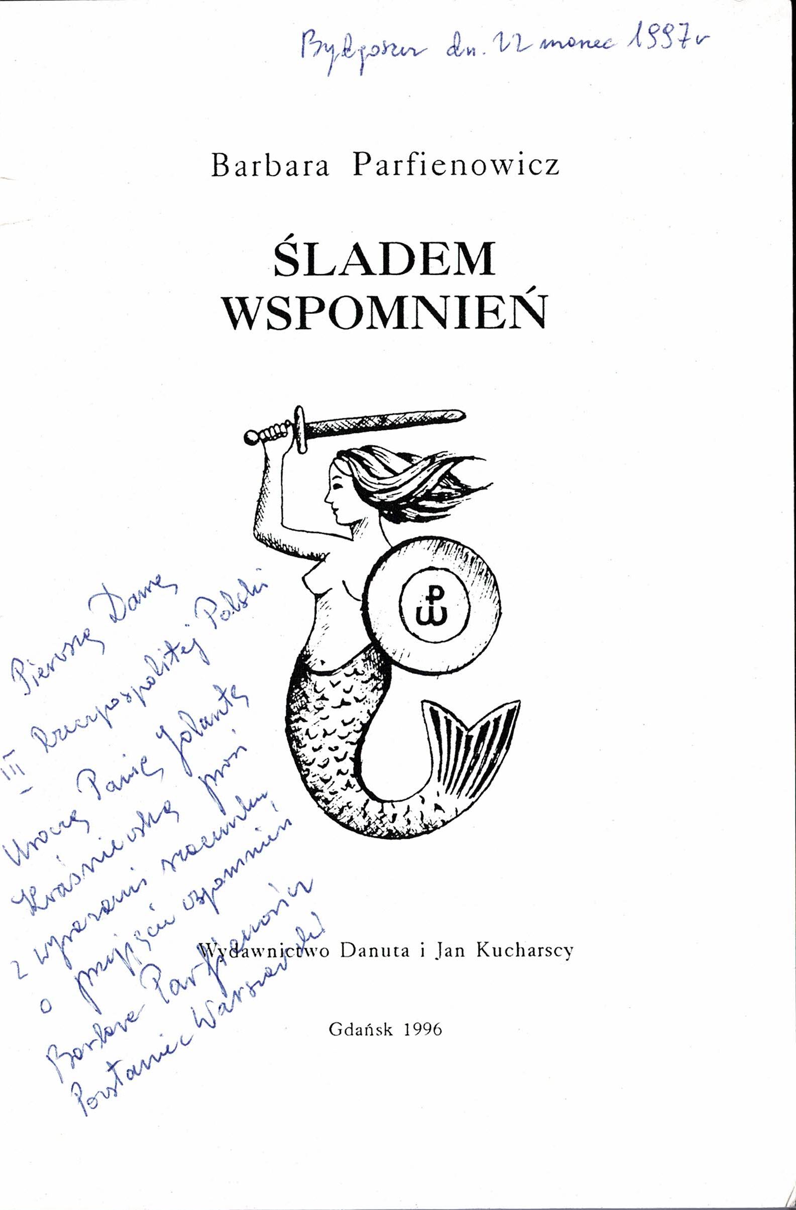 Treść dedykacji: Pierwszą Damę III Rzeczypospolitej Polski Uroczą Panią Jolantę Kwaśniewską prosi z wyrazami szacunku o przyjęcie wspomnień Barbara Parfienowicz Powstanie Warszawskie