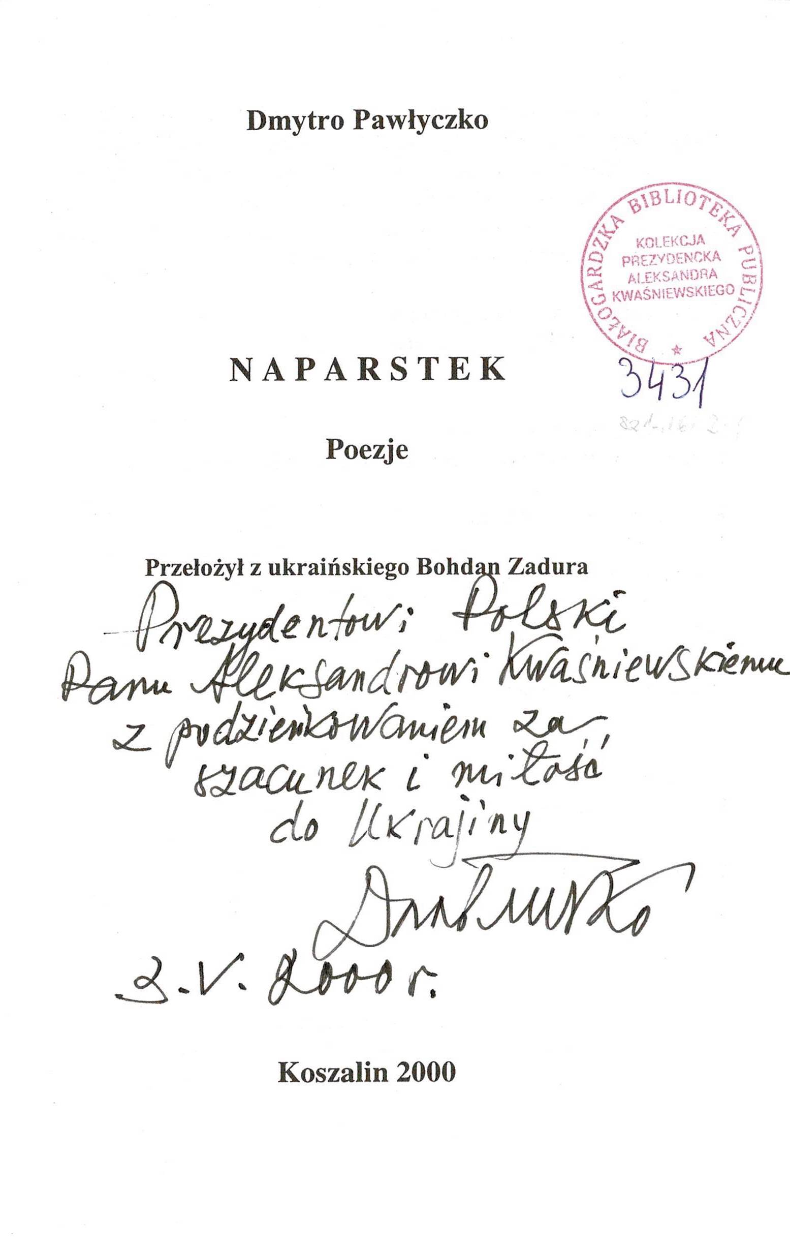 Treść dedykacji: Prezydentowi Polski Panu Aleksandrowi Kwaśniewskiemu z podziwem za szacunek i miłość do Ukrainy