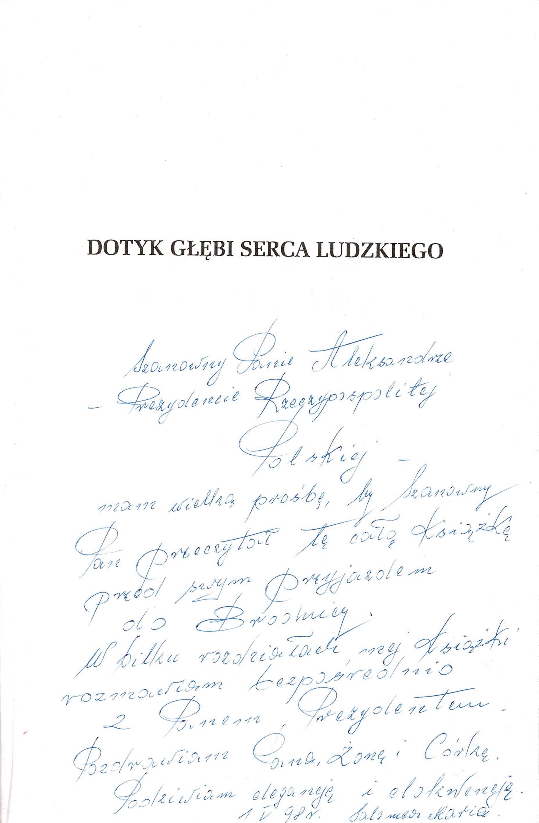 Treść dedykacji: Sznowny Panie Aleksandrze - Prezydencie Rzeczypospolitej Polskiej - mam wielka prośbe, by Szanowny Pan przeczytał tę całą książkę przed swym przyjazdem do Brodnicy. W kilku rozdziałach mej książki rozmawiam bezpośrednio z Panem Prezydentem. Pozdrawiam Pana, Żonę i Córkę. Podziwiam elegancję i elokwencję. 1 V 98 r. Salomea Maria.