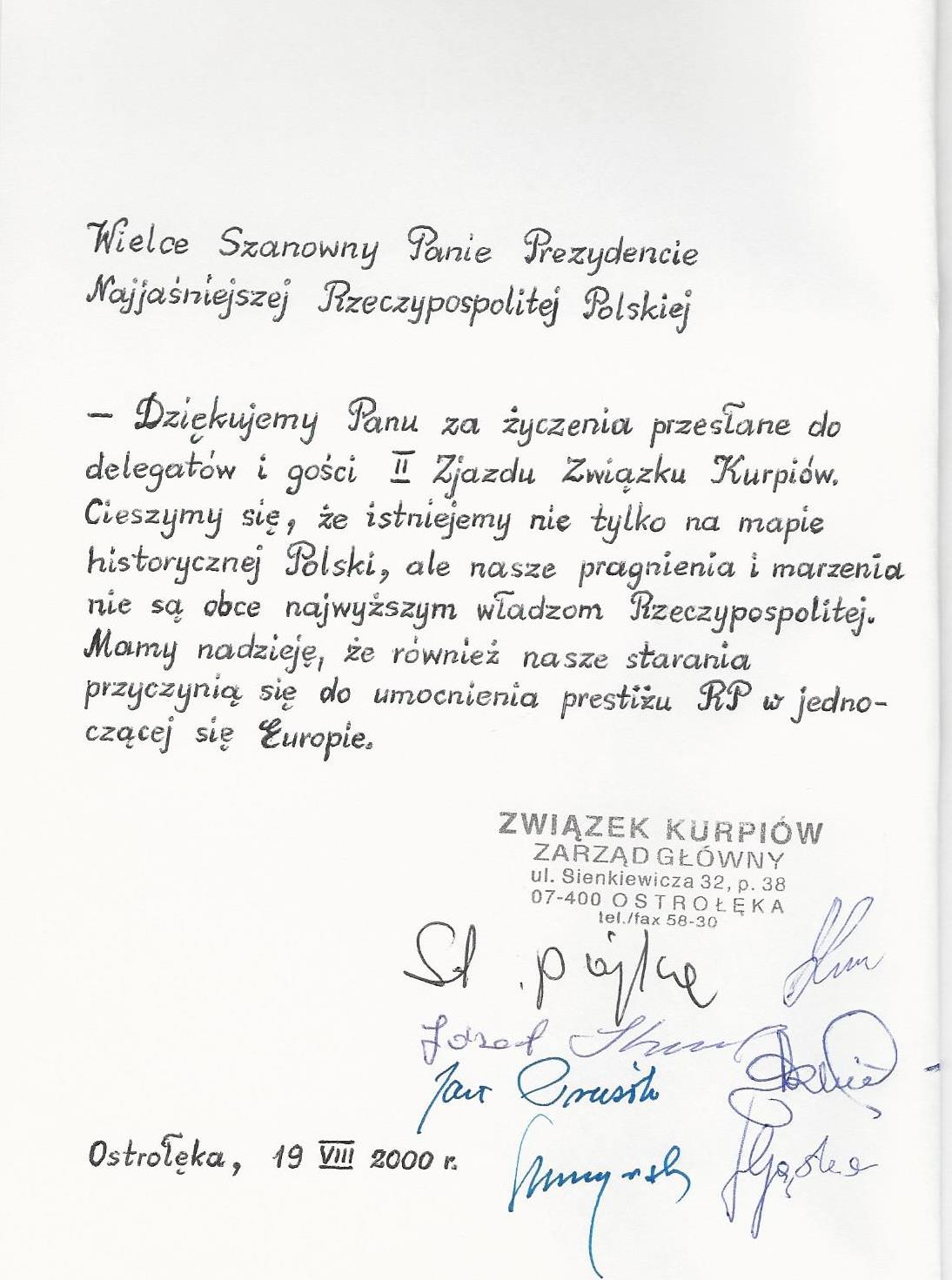 Treść dedykacji: Wielce Szanowny Panie Prezydencie Najjaśniejszej Rzeczypospolitej Polskiej - Dziękujemy Panu za życzenia przesłane do delegatów i gości II Zjazdu Związku Kurpiów. Cieszymy się, że istniejemy nie tylko na mapie historycznej Polski, ale nasze pragnienia i marzenia nie są obce najwyższym władzom Rzeczypospolitej. Mamy nadzieję, że również nasze starania przyczynią się do umocnienia prestiżu RP w jednoczącej się Europie. Ostrołęka, 19 VIII 2000 r.