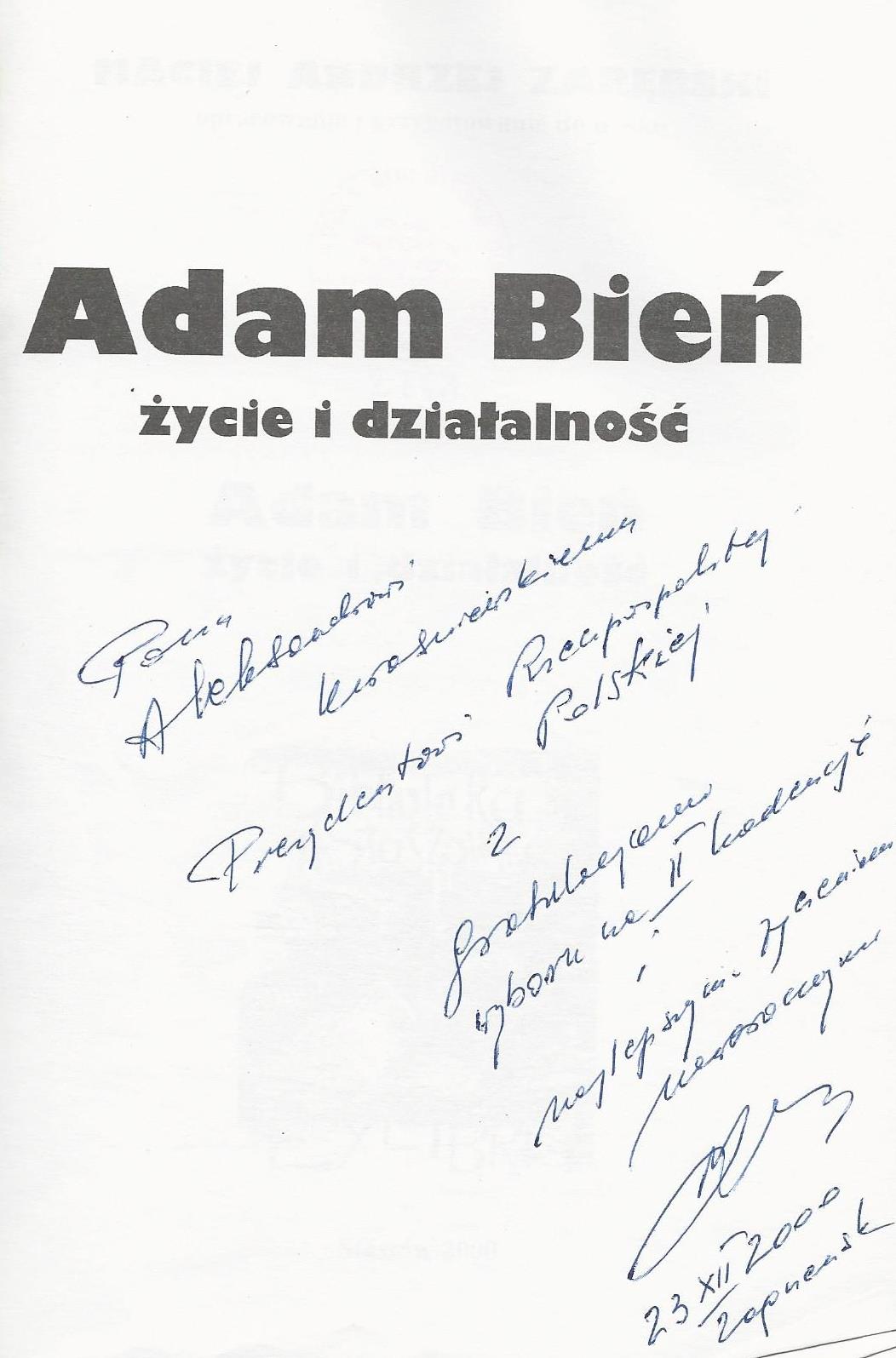 Treść dedykacji: Panu Aleksandrowi Kwasniewskiemu Przeydentowi Rzexzypospolitej POlskiej z gratulacjami wyboru na II kadencję i najlepszymi życzeniami Zarębski 23 XII 2000