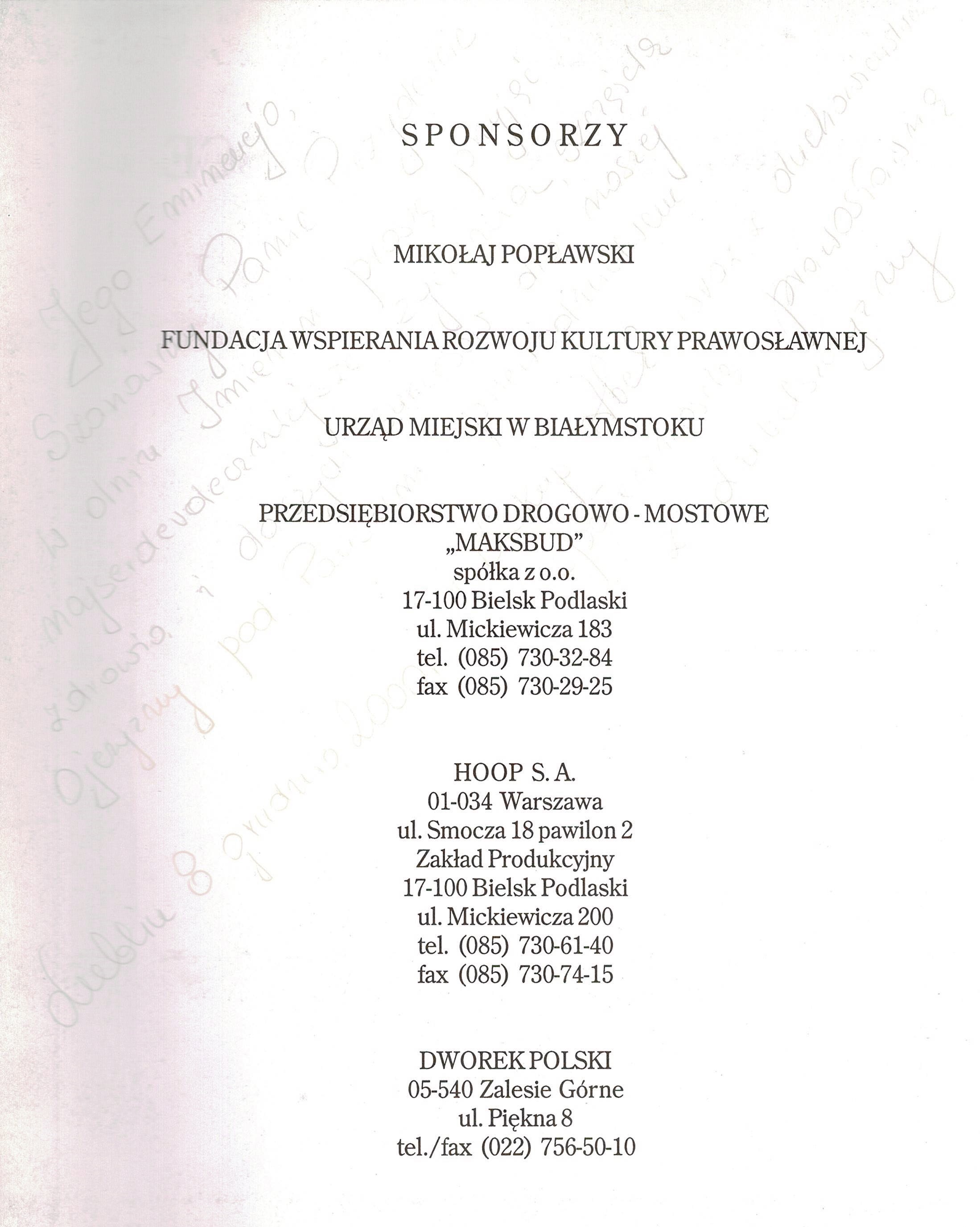 Treść dedykacji: Panu Prezydentowi RP Aleksandrowi Kwaśniewskiemu na pamiątkę pobytu w Hajnowskiej Katedrze Prawosławnej Świetej Trójcy z najserdeczniejszymi życzeniami Błogosławieństwa Bożego (nieczytelne) Hajnówka 2000.09.25