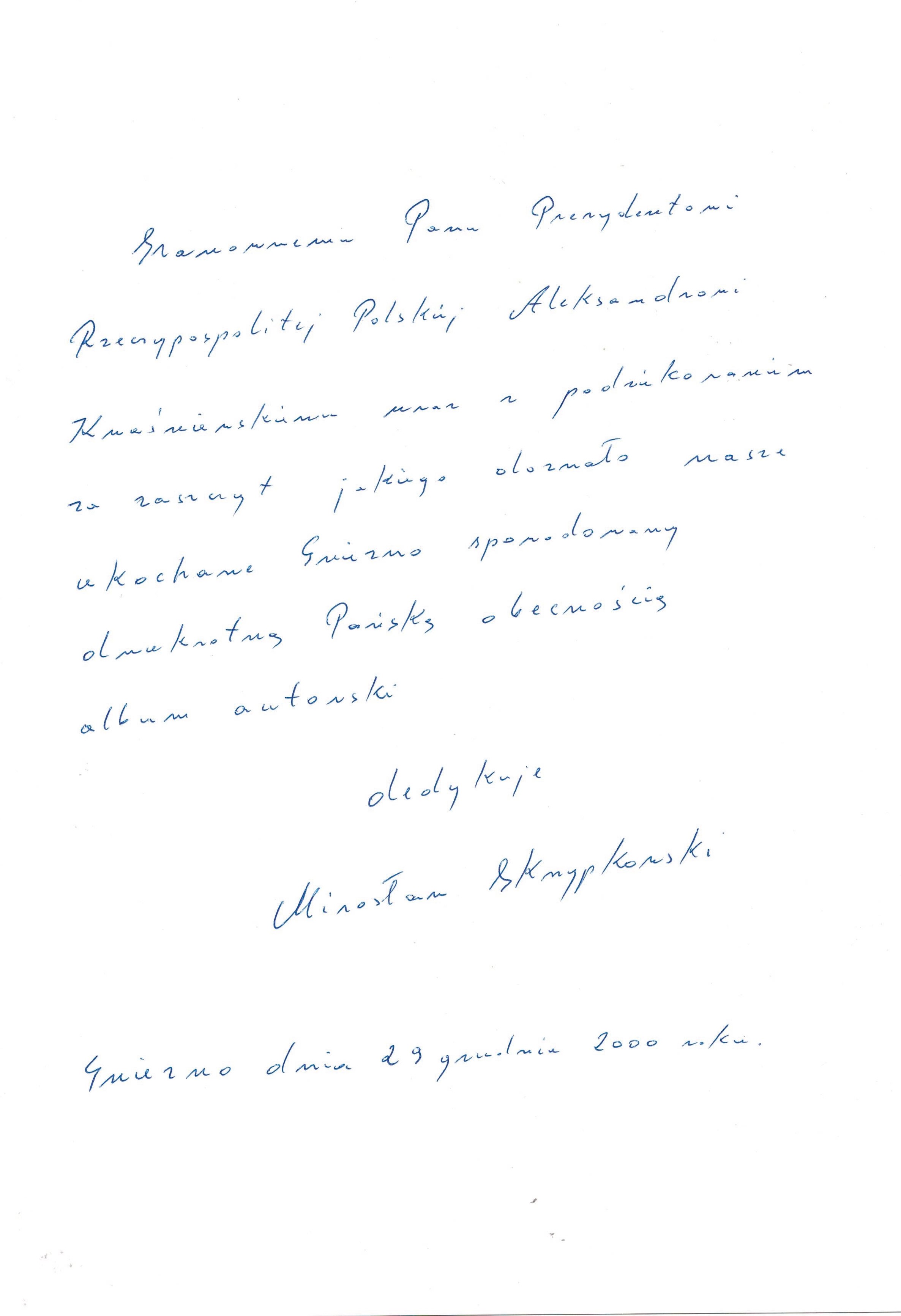 Treść dedykacji: Szanownemu Panu Prezydentowi Rzeczypospolitej Polskiej Aleksandrowi Kwaśniewskiemu wraz z podziękowaniem za zaszczyt jakiego doznało nasze ukochane Gniezno spowodowany dwukrotną Pańską obecnością album autorski dedykuje Mirosław Skrzypkowski Gniezno dnia 29 grudnia 2000 roku.