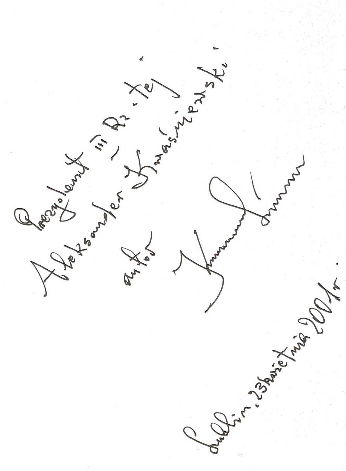 Treść dedykacji: Prezydent III Rz.tej Aleksander Kwaśniewski autor Kazimierz Liszcz Lublin, 23 kwietnia 2001r.