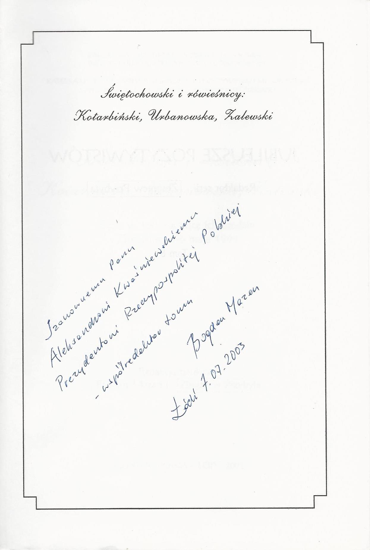 Treść dedykacji: Szanownemu Panu Aleksandrowi Kwasniewskiemu Prezydentowi Rzeczypospolitej Polskiej - współredaktor tomu Bogdan Mazen Łódź 7.07.2003