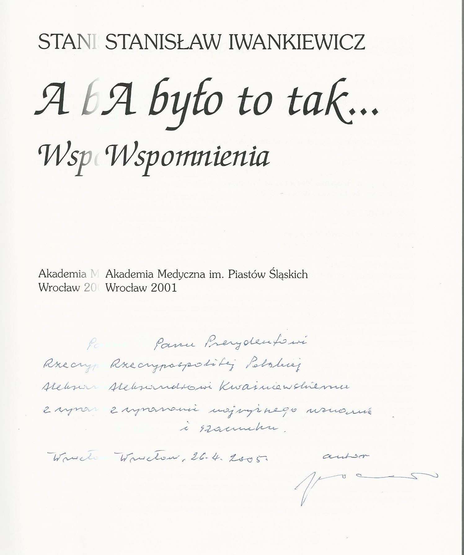 Treść dedykacji: Panu Prezydentowi Rzeczypospolitej Polskiej Aleksandrowi Kwaśniewskiemu z wyrazami najwyższego uznania i szacunku. autor Wrocław, 26.4.2005r