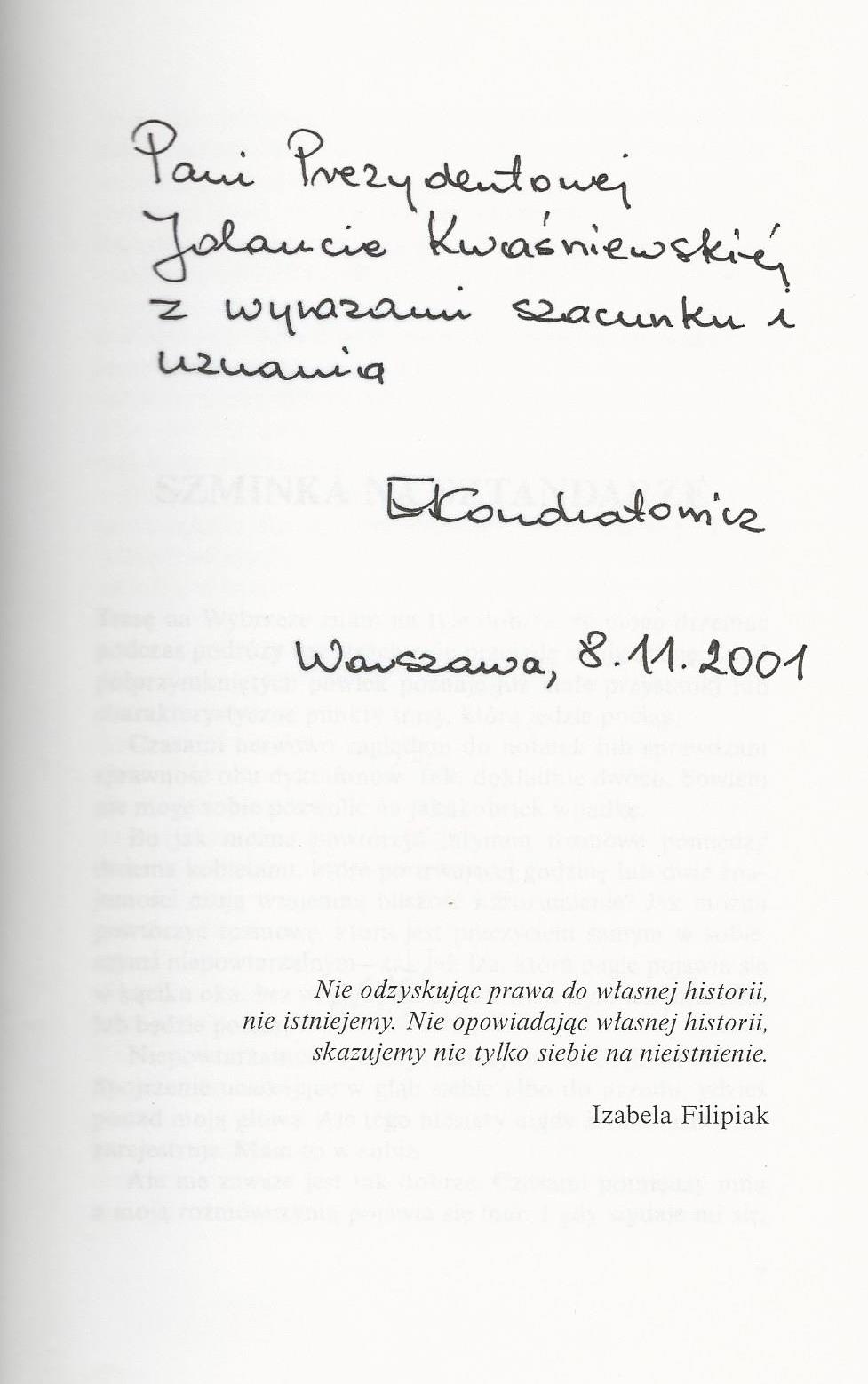 Treść dedykacji: Pani Prezydentowej Jolancie Kwaśniewskiej z wyrazami szacunku i uznania E. Kondratowicz Warszawa, 8.11.2001