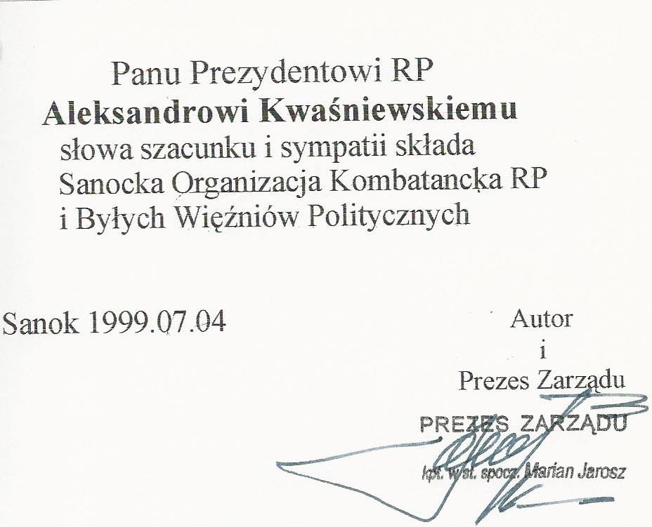 Treść dedykacji: Panu Prezydentowi RP Aleksandrowi Kwaśniewskiemu słowa szacunku i sympatii składa Sonacka Organizacja Kombatancka RP i Byłych Więźniów Politycznych Sanok 1999.07.04