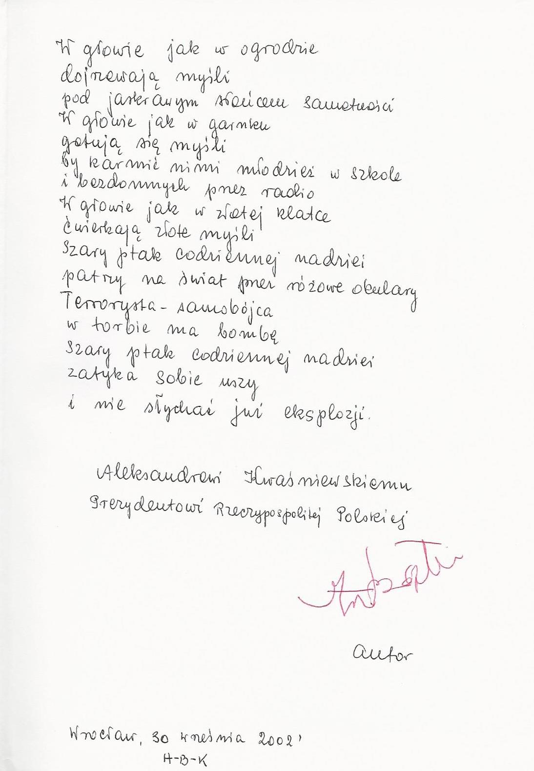 Treść dedykacji: W głowie jak w ogrodzie dojrzewają myśli pod jaskrawym słońcem samotności w głowie jak w garnku gotują się myśli by karmić nimi młodzież w szkole i bedomnych przez radio w głowie jak w wartej rzece ćwierkają złote myśli patrzy na świat przez różowe okulary szary Terrorysta - samobujca w torbie ma bombę szary ptak codziennej nadziei i nie słuychaćm już eksplozji Aleksandrowi Kwaśniewskiemu Prezydentowi Rzeczypospolitej Polskiej Andrzej Bartyński autor Wrocław, 30 września 2002, H-B-K